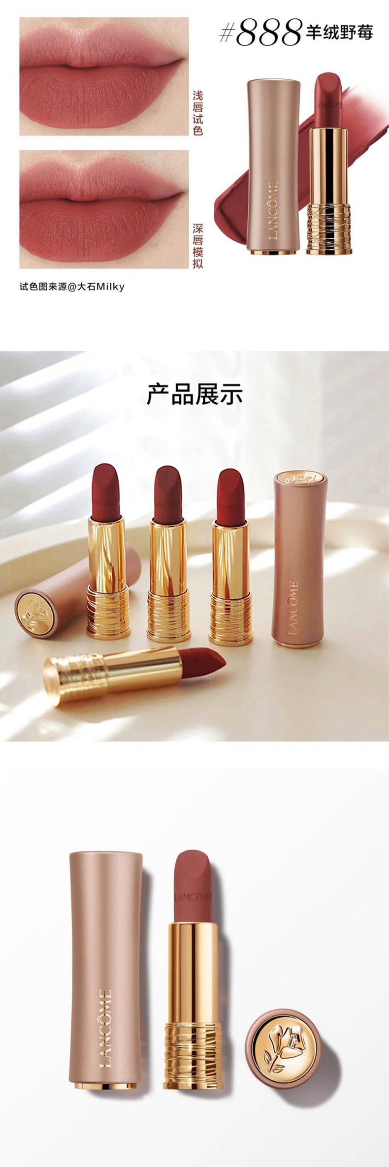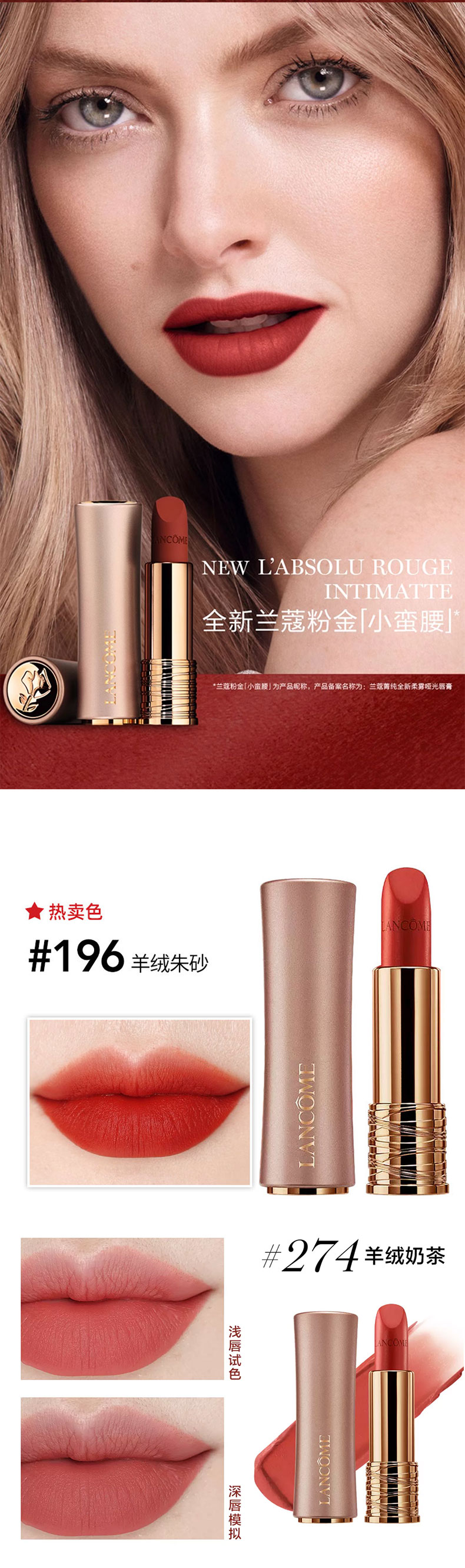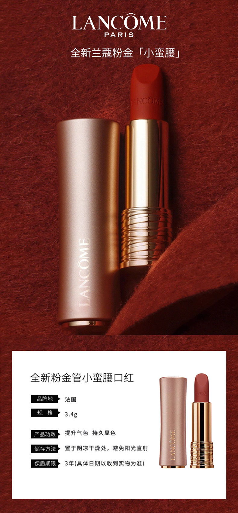 【品牌】 LANCOME兰蔻【商品名称】 :LANCOME兰蔻粉金管小蛮腰口红3.4g 香港直邮【规格】:#888羊绒野莓#274羊绒奶茶#196羊绒朱砂【产地】:法国(实际收到为准)【批次/限用日期】【注!!!】批次更新较快,具体以实收批次日期为准【版本】:免税版【包装方式】:单独 无盒【快递】:韵达快递【发货地】:香港【运费模板】: 新疆,宁夏,内蒙古,甘肃+5,其他地区包邮【不发货地区】:港澳台 西藏【发货时效】:72小时【售后政策】:支持七天无理由退换(不影响二次销售的基础上)