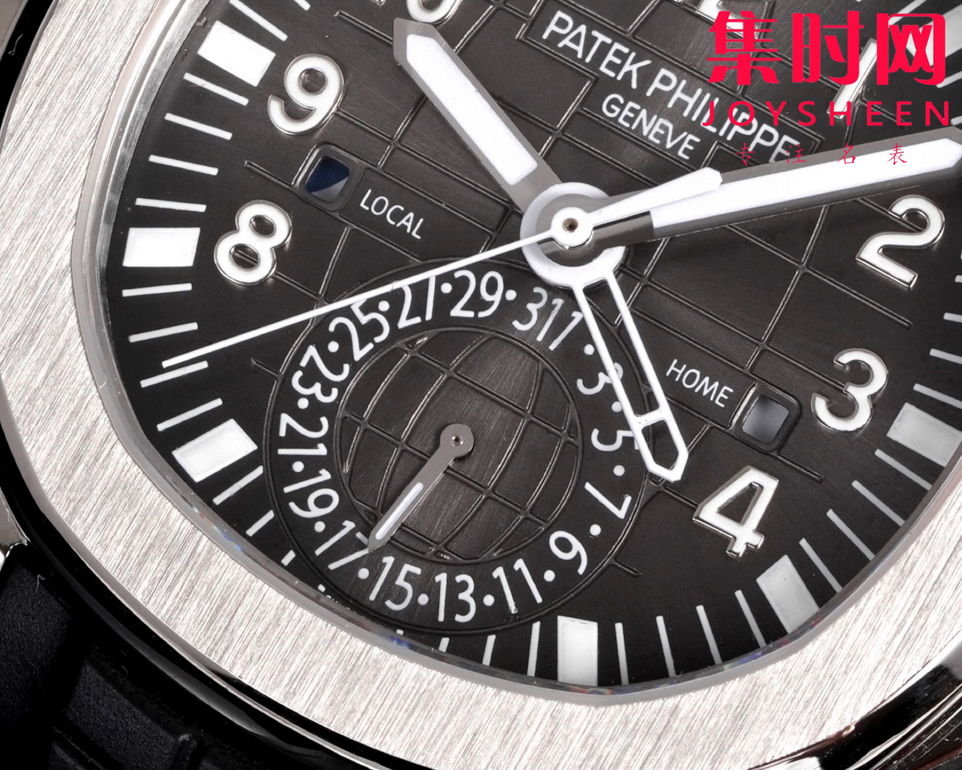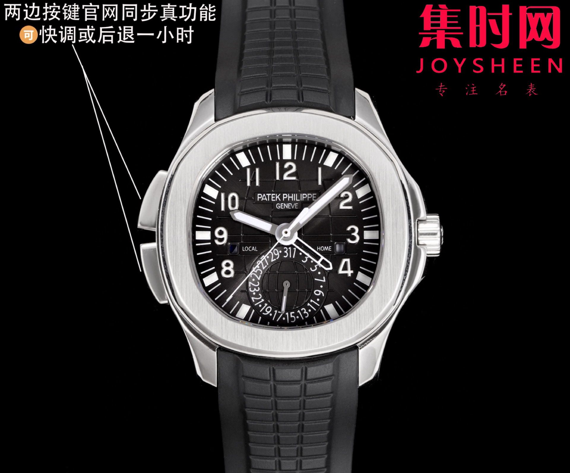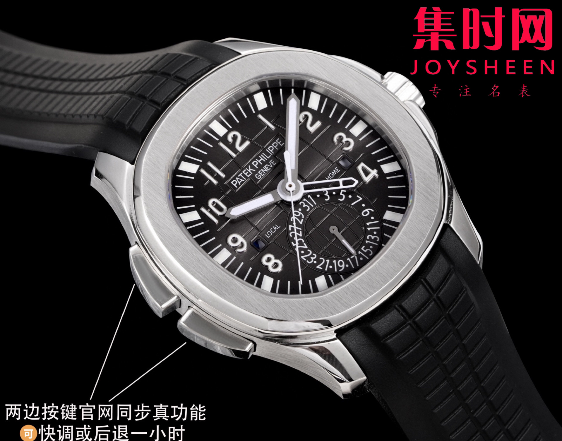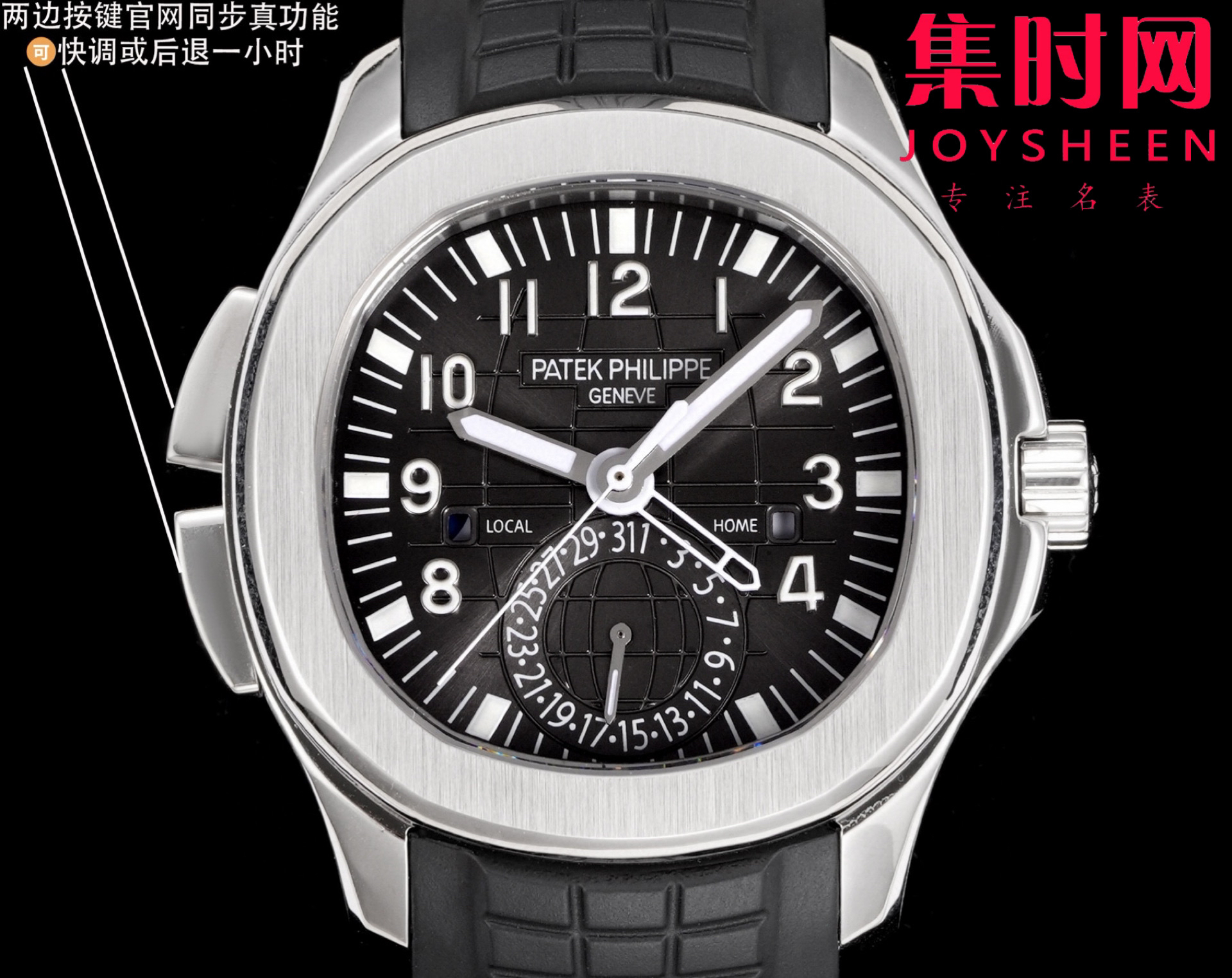 PP百达翡丽 AQUANAUT系列 PP手雷5164系列 男士腕表 功能对版,一款集创新技术,实用功能独特设计于一身的运动腕表。表径40.8mm,不锈精钢材质,经过抛光和拉丝交替处理,层次感强。表带采用氟橡胶带材质,背面为舒适的技术材质,这种表带非常柔软,耐用且贴合手腕。这款手雷腕表的灵魂所在,并非他简单的GMT针,而是百达翡丽专利的两地时机制,操作极其优雅和便捷。表壳左侧有两个隐藏式按钮,分别都用于快调时针,双时区,实现功能对版。表盘左右各有一个小巧的视窗,分别显示 LOCAL 和HOME的昼夜状态  。搭载百达翡丽Caliber324S S FUS自动上链机械机芯,拥有Gyromax摆轮和Spromax游丝,确保每天走时的超高精准。用心良苦打造首家对版功能,欢迎各大表友品鉴
