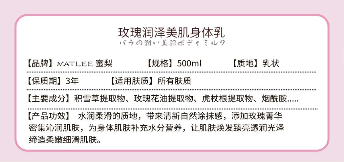 【中欧班列精选】日本蜜梨品牌身体乳 玫瑰润泽美肌身体乳 500ml/瓶