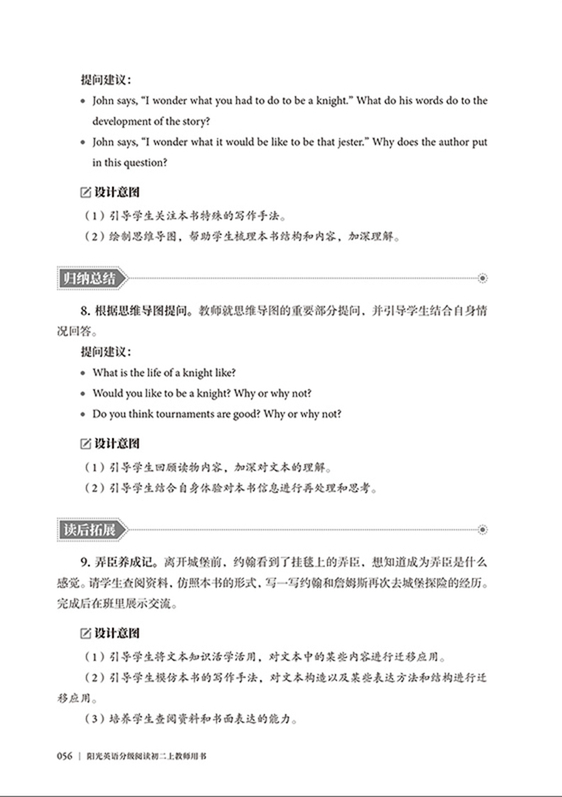 《阳光英语分级阅读初二上教师用书》配合阳光英语初二上套装的9册英文读物使用,收录了9个优秀课例,帮助老师上好初二上学期的阅读/读写课。本书由浙江省宁波市海曙区教育局教研室英语教研员刘桂蓉老师担任分册主编,优秀一线英语教师编写,为每一本读物撰写了详细的文本分析,为每一个课例设计清晰的思维导图、明确的教学目标、丰富的阅读学案以及具有综合性、关联性和实践性的课堂教学活动。配合使用的英语读物为