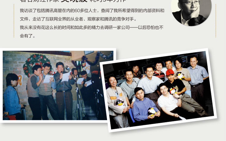 更令人吃惊的是,甚连腾讯自身也对自己的历史漫不经心。它的档案管理可以用“糟糕”两个字来形容,很多原始文件没有被保留下来,重要的内部会议几乎没有文字记录。腾讯人告诉我,腾讯是一家靠电子邮件来管理的公司,很多历史性的细节分散于参与者的记忆和私人邮箱里。当我开始创作的时候,对这一景象感到非常的意外,而腾讯人居然很轻松地对我说:“在互联网行业里,所有人的眼睛盯着未来,昨天一旦过去,就没有什么意义了。”绝大多数的腾讯高管是技术出身,他们对数据很敏感,可是对于我所需要的细节则一脸茫然。很多重要的场合没有留下任何影像——无论是照片还是视频。