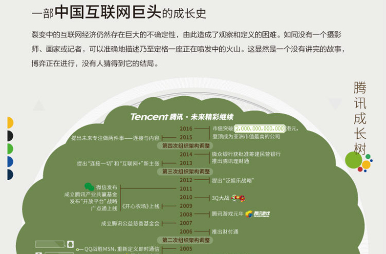 在很长的时期里,腾讯是中国互联网世界的一个秘密。其宛如一只正在进化中的生物体,我们对它的过往经历所知不详,然而更被它正在发生的进化所吸引和裹挟。裂变中的互联网经济今仍然存在巨大的不确定性,造成了观察和定义的困难,谁无法准确地描述乃定格一座正在喷发中的火山。