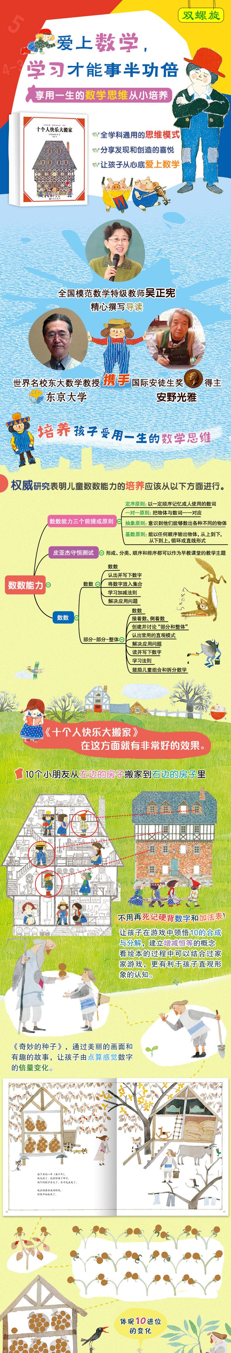 《十个人快乐大搬家》巧妙的纸上游戏,“10个孩子、两栋房子”,设计生动有趣。彩色的楼房外形,黑白的房子内景,繁杂的房子摆设,人物位置的变化,让孩子掌握10的组成与分解。在数量增减的变化中体会“恒等”。“变中有不变”的思想也渗透其中。“天窗”的变换,色彩的搭配,延长了孩子的关注时间,激发了儿童的学习兴趣,。 《奇妙的种子》通过种子种植后的变化与生长,让儿童“看到”这种变化的规律,感受“数字倍增”的惊奇。 《帽子戏法》像推理小说解谜一样有趣的数学侦探游戏绘本。 通过猜测帽子的颜色,锻炼小朋友的推理和观察能力,逐步培养他们对假设法和排除法的理解。 《壶中的故事》这个故事是以壶中有一个小岛,岛中有两个国家,两个国家各有三座山…一直往下类推的方式来表现数目不断增加的过程,让小朋友在阅读中建立数学阶乘法的概念。 《三只小猪》本书中讲述的是一只叫“苏格拉底”的大灰狼和三只小猪的故事。大灰狼夫妇想......
