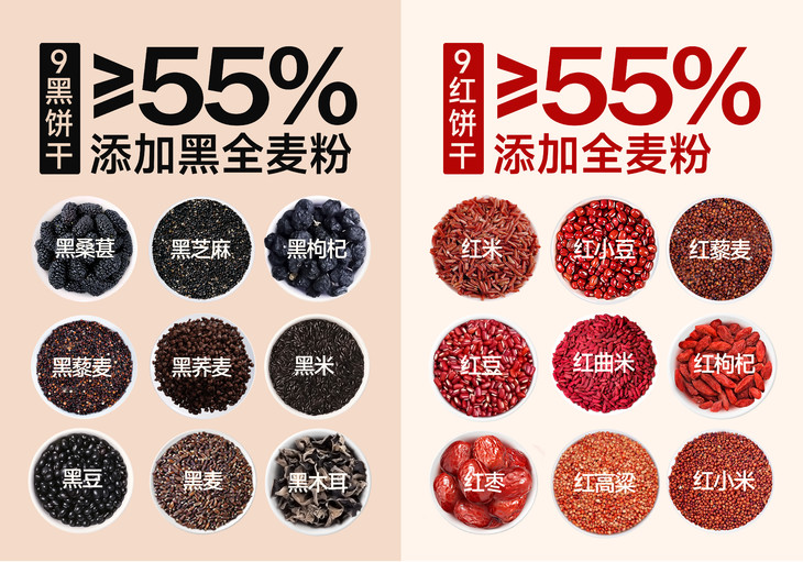 经常听人家说,补品一堆,不如多吃五谷杂粮,尤其是这种添加了九种食材的!! 真实食材添加❗ 产品名字即配料表❗❗ ✅9红:全麦粉添加量≥55% 内含9种红色食材:红豆、红小豆、红枣、红枸杞、红米、红高梁、红曲米、红小米、红藜麦 ✅9黑:全麦粉添加量≥55% 内含9种黑色食材:黑豆、黑芝麻、黑麦、黑米、黑桑葚、黑荞麦、黑木耳、黑枸杞、黑藜麦 比起普通饼干,家里人更适合吃这种健康的!!