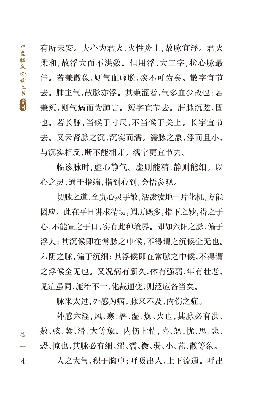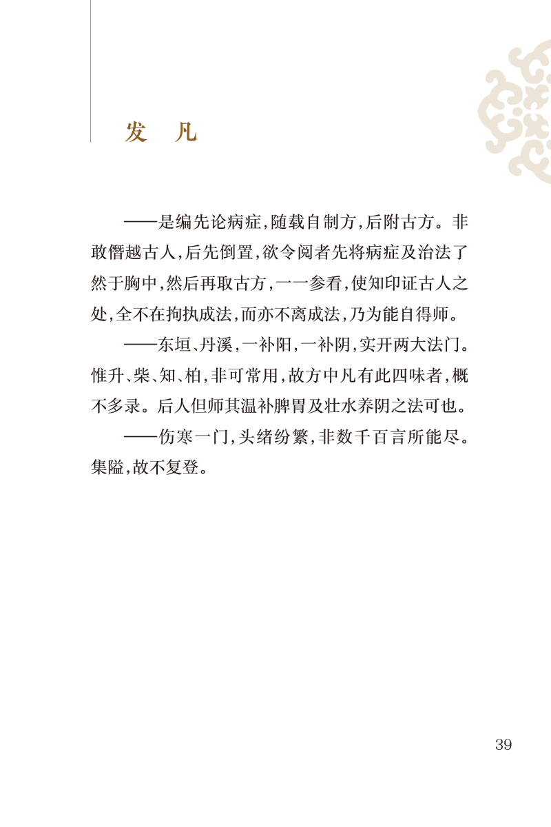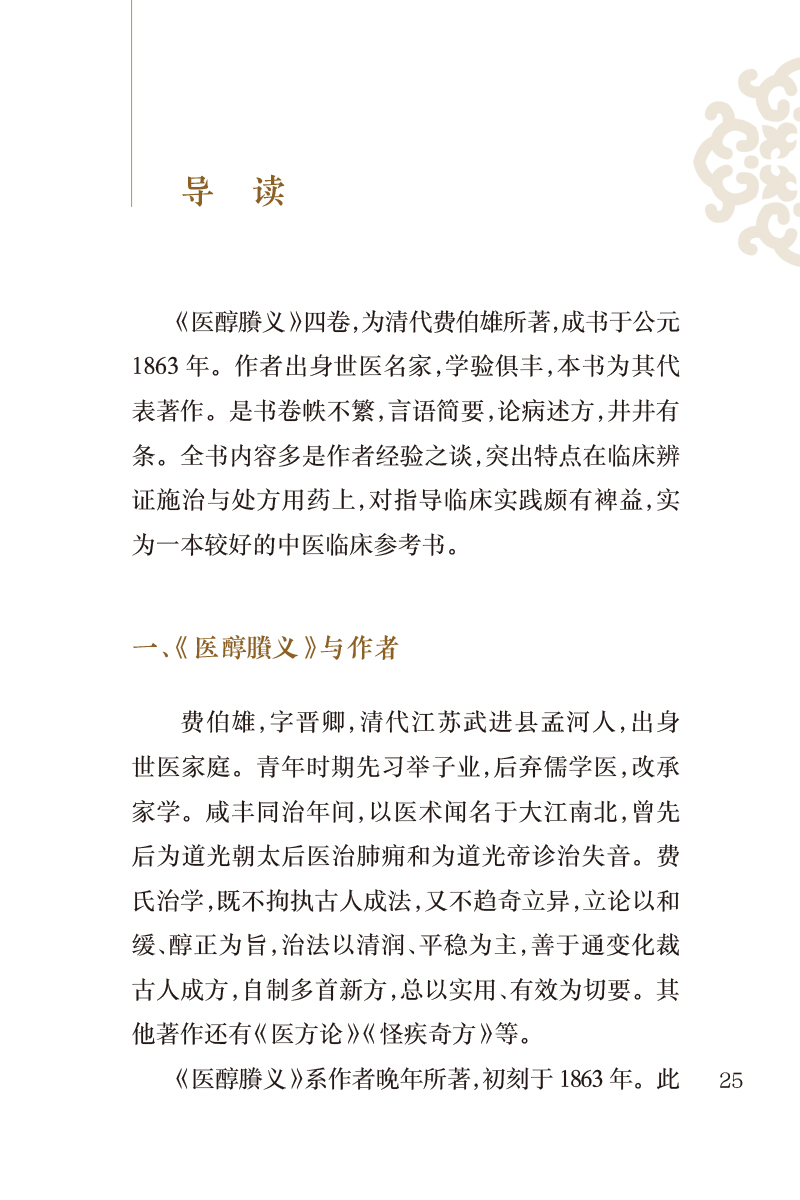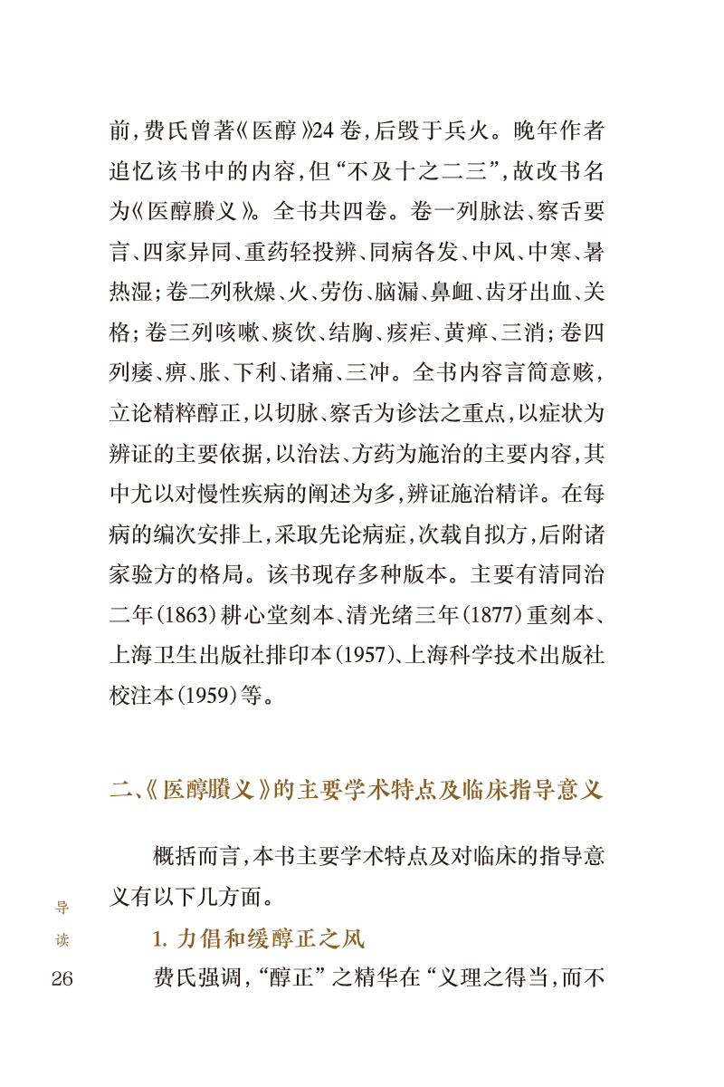 本书为清代医家费伯雄所著,共4卷。卷一列脉法、察舌要言、四家异同、重药轻投辨、同病各发、中风、中寒、暑热湿:卷二列秋燥、火、劳伤、脑漏、鼻衄、齿牙出血;卷三列咳嗽。痰饮、结胸、痃疟、黄瘅、三消;卷四列痿、痹、胀、下利、诸痛、三冲。全书以切脉、察舌为诊法之重点,以症状为辨证的主要依据。以治法、方药为施治的主要内容,其中尤以对慢性疾病的阐述为多。编次安排上,采取先论病症,次载自拟方,后附诸家验方的格局。全书共载方480余首,其中作者自创新方近200首。