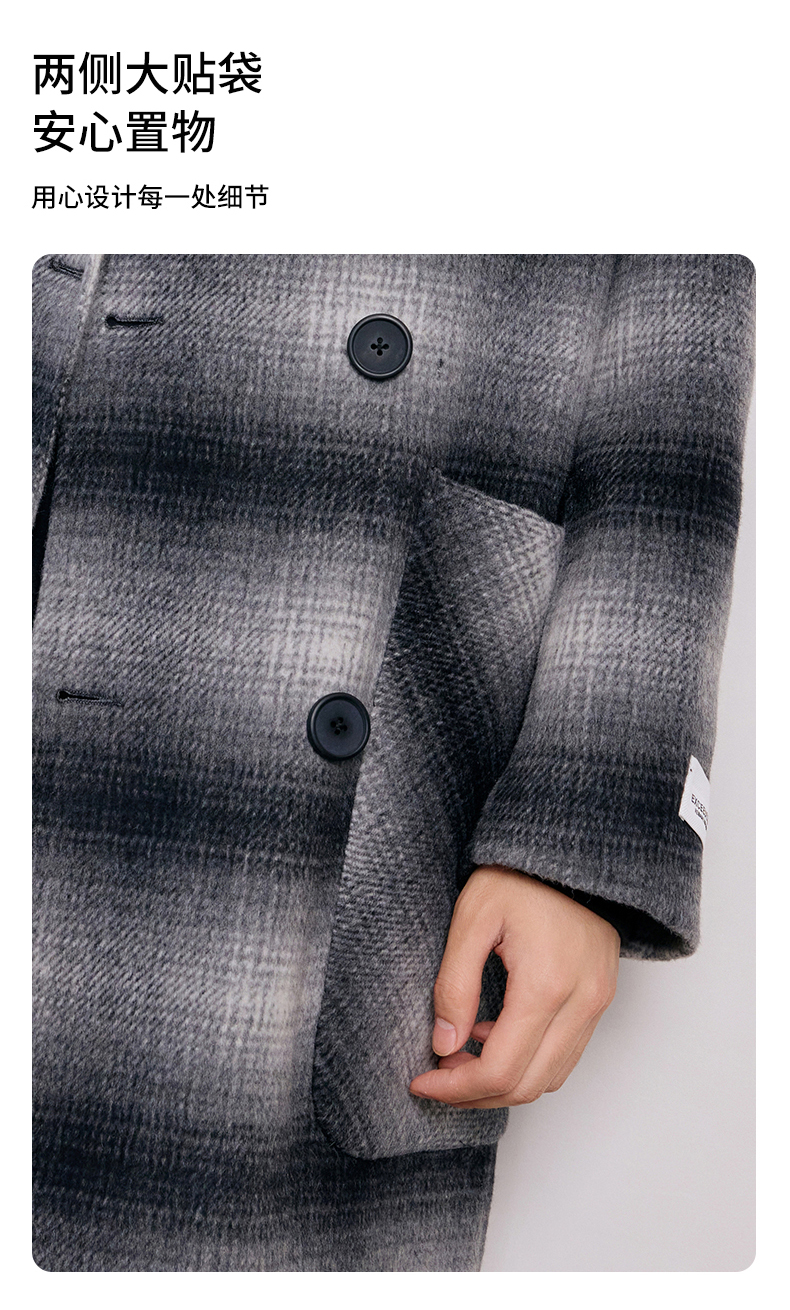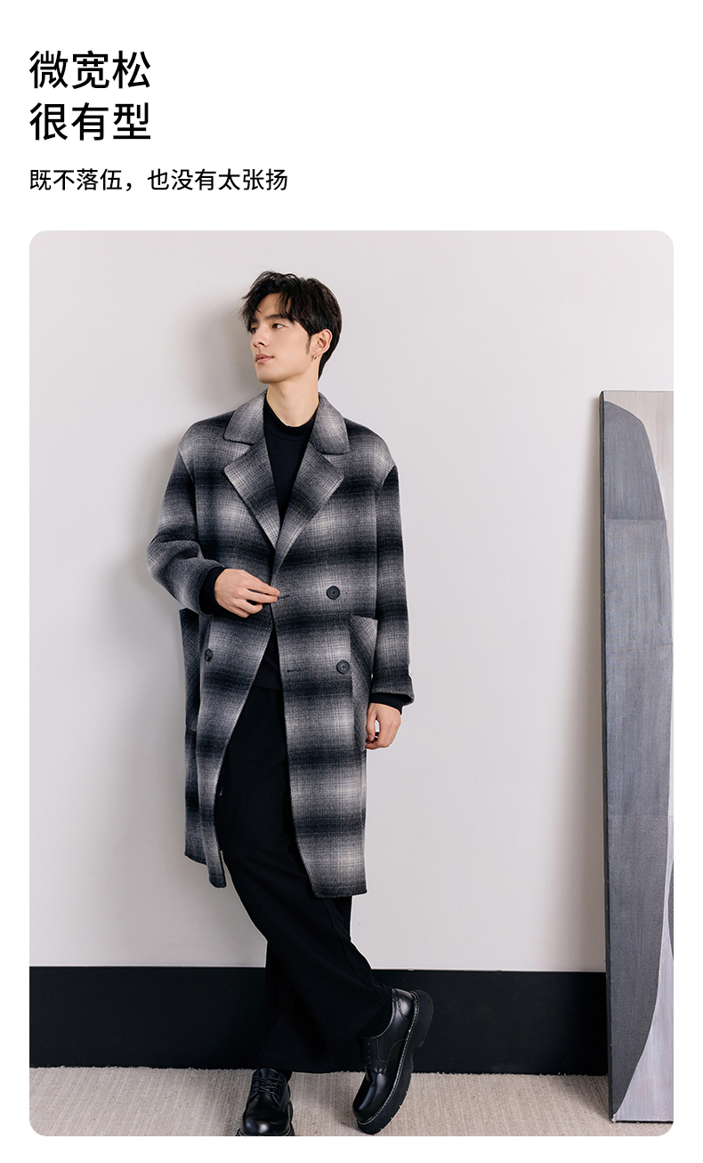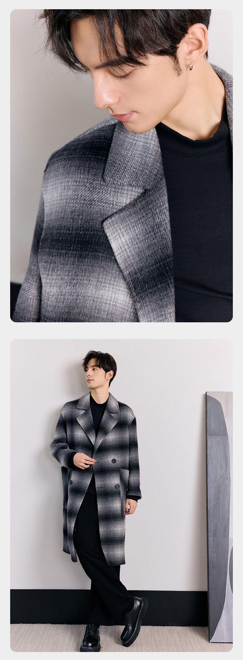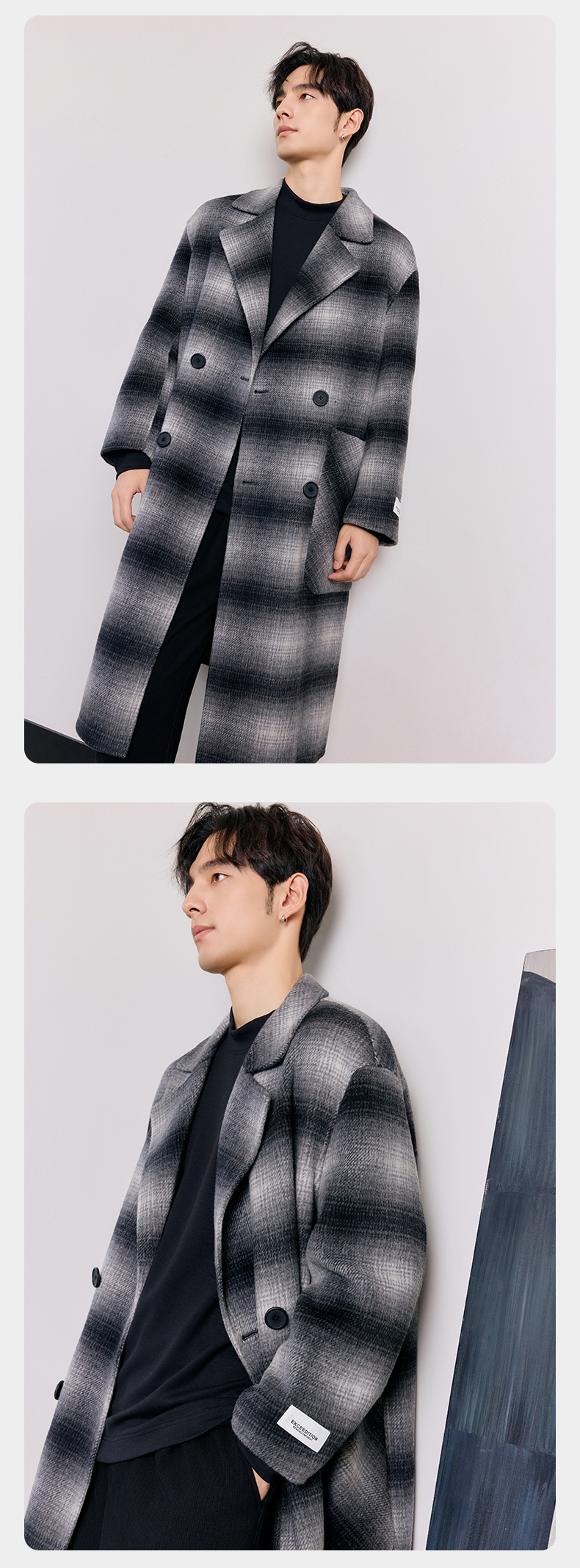 贝纳川冬季长款黑白格子羊毛大衣ECT328003