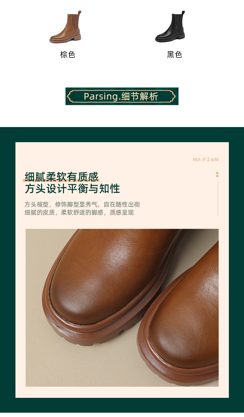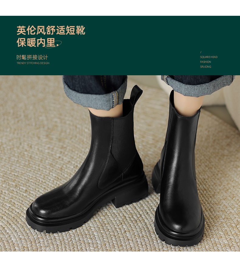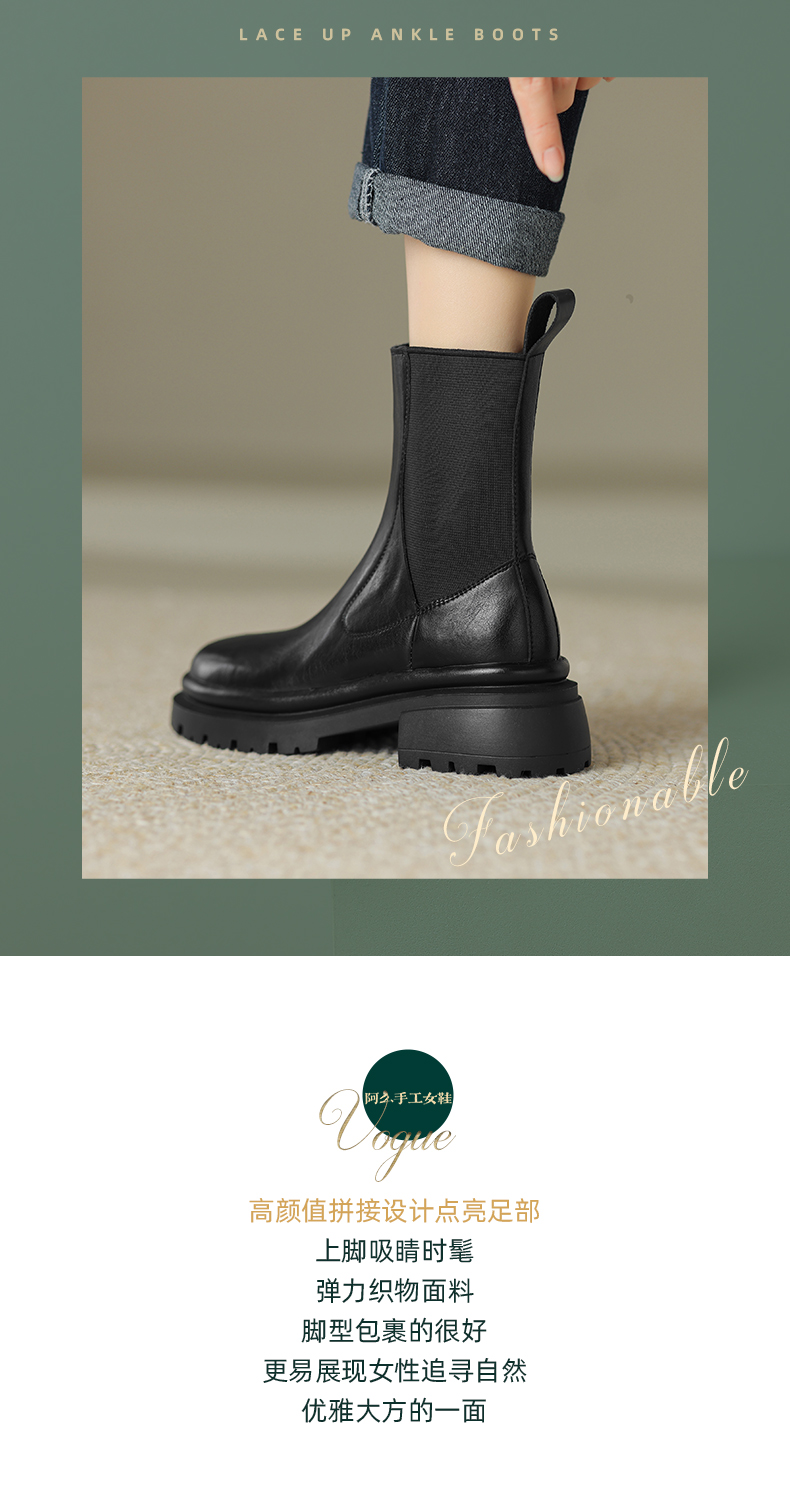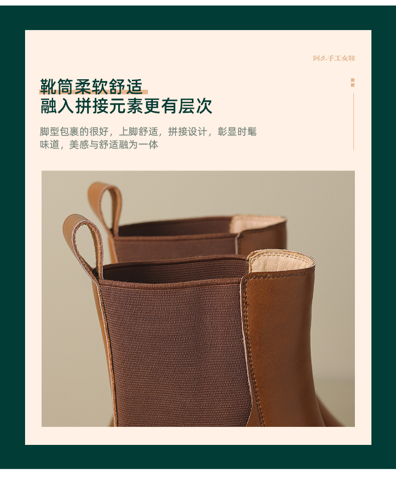阿么手工女鞋圆头齿轮鞋一脚蹬短靴女5CM秋冬保暖切尔西靴英伦风