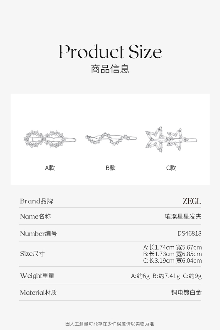 ZEGL璀璨星星发夹女2023新款后脑勺一字夹青蛙扣边夹侧边夹子头饰