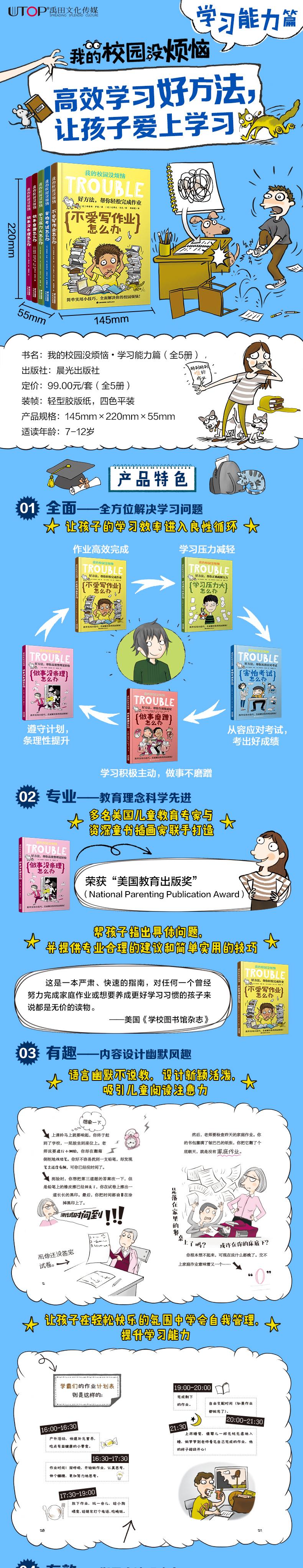 “我的校园没烦恼”是一套专门针对儿童的行为自我管理和学习能力培养而设计的自助成长系列图书。全系列选取了儿童在校园生活中普遍存在的10个烦恼方向——不爱写作业、学习压力大、害怕考试、做事磨蹭、做事没条理,通过风趣幽默的语言、搞笑好玩的插图,以及新颖别致的排版方式,为孩子解决这些问题提供了专业合理的建议和简单实用的技巧。孩子能够在不枯燥的阅读中掌握一系列简单实用的方法,快速有效地解决他们在校园中可能遇到的烦恼问题。