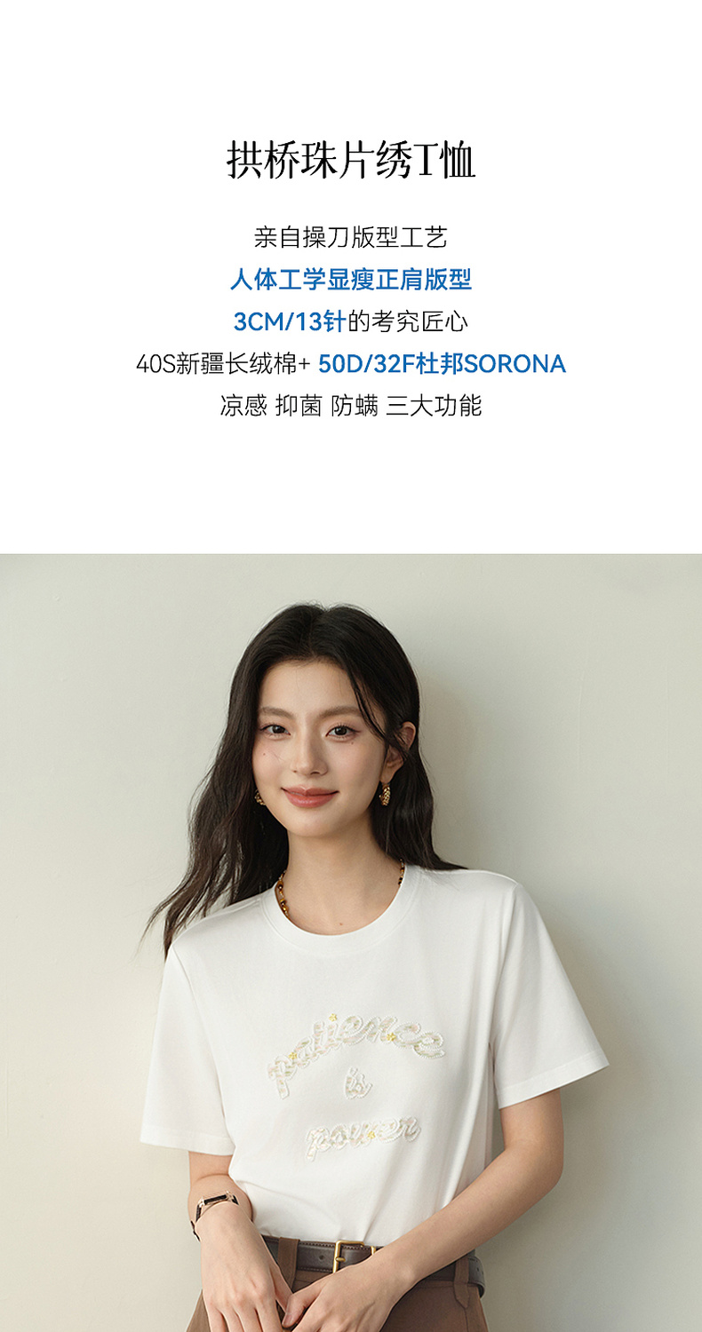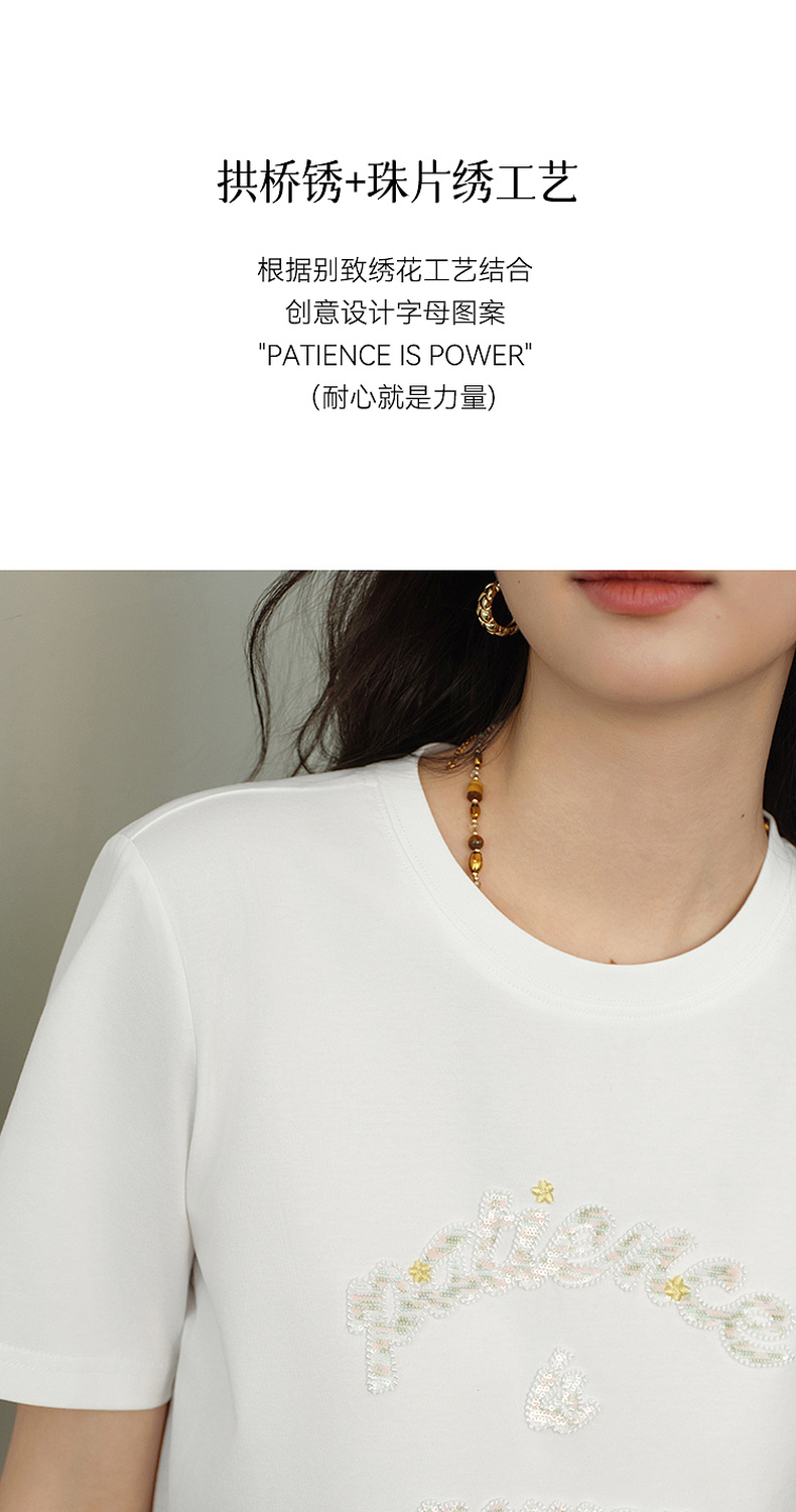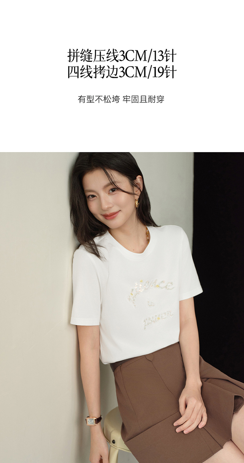 【严选】诗凡黎字母珠片绣凉感T恤2026春新款正肩显瘦内搭长绒棉短袖上衣7H2200241