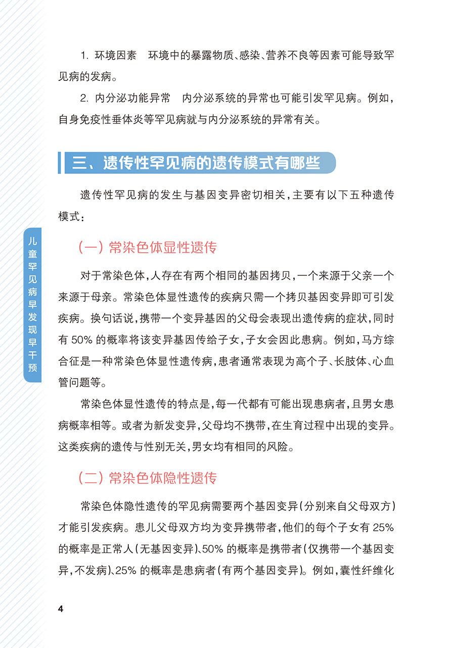 罕见病是一类发病率很低,大多数具有遗传性的疾病,属于出生缺陷范畴。2018年,我国发布了《第一批罕见病名录》,共包含了121种罕见病,其中80%为遗传性疾病,其他则是由感染(细菌或病毒)、过敏和环境原因引起,或者是退行性和增生性的。本书主要根据世界卫生组织提出的三级预防策略,用通俗易懂的科普语言,对50种儿童罕见病从以下几方面阐述:面容特征:通过绘图和文字,描述独特的面容、外貌、动作特征。临床诊断:阐述临床诊断,包括症状、体征、实验室检查、基因诊断。干预方法:介绍患者家属关心的如何采取药物、手术方式、康复策略。护理注意事项:从营养、生活方式、心理疏导等方面进行相应疾病的个性化护理。
