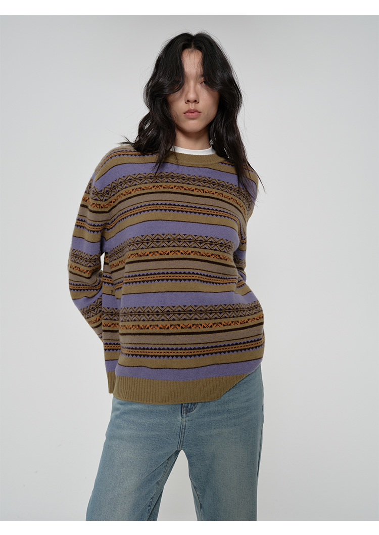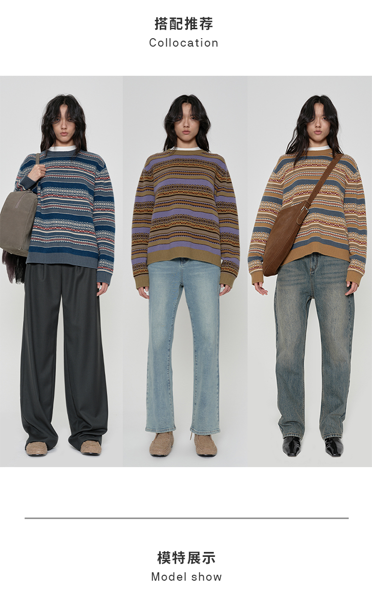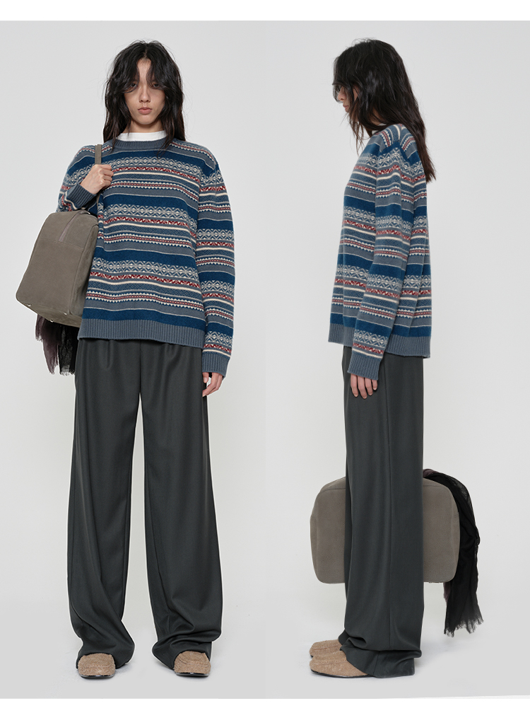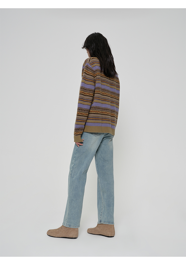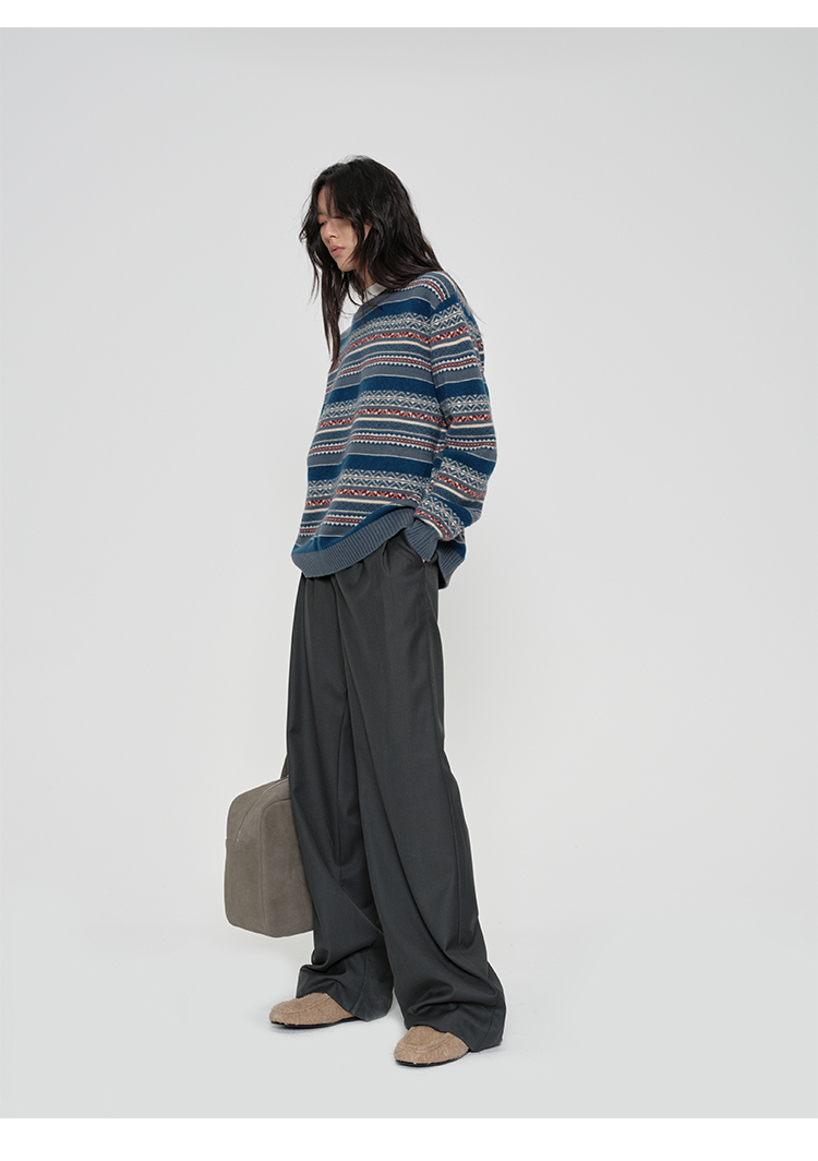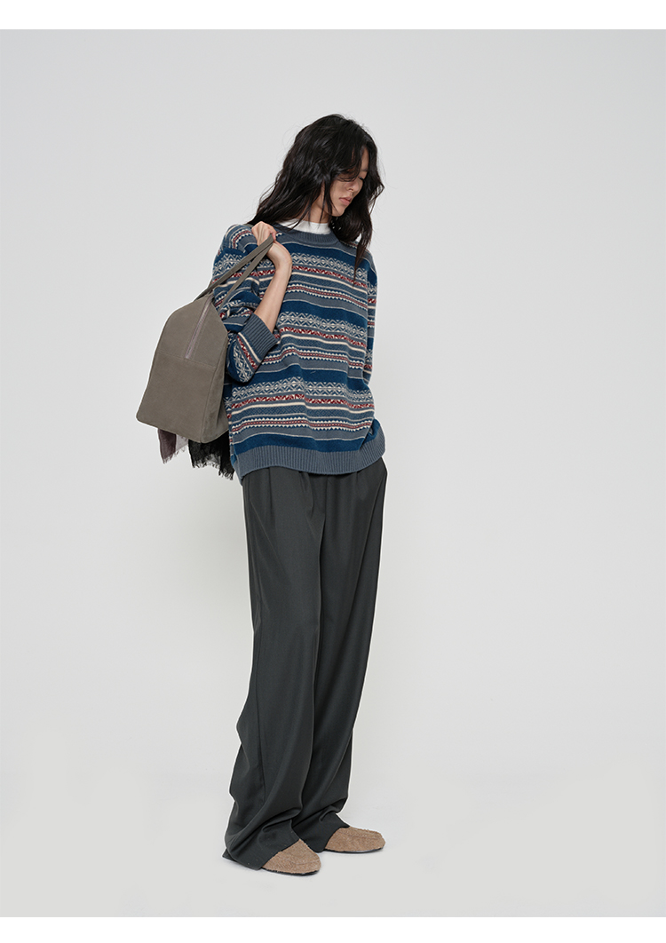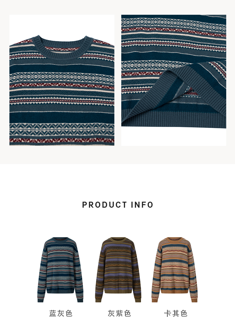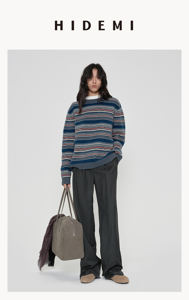 HIDEMI 【赵丽颖同款】进口澳洲美利奴羊毛手绘花型设计感极简圆领廓形落肩款长袖针织毛织毛衣 卡其色/蓝灰色/灰紫色