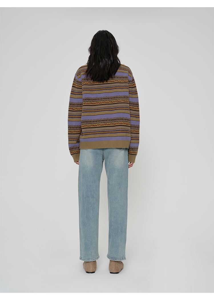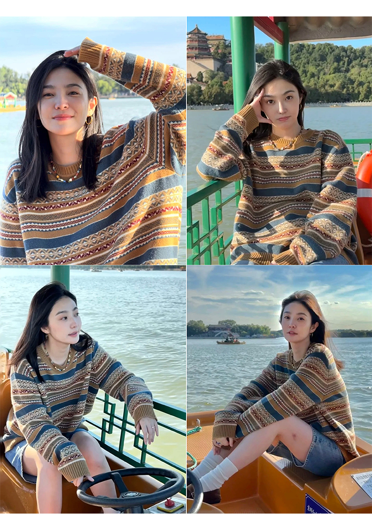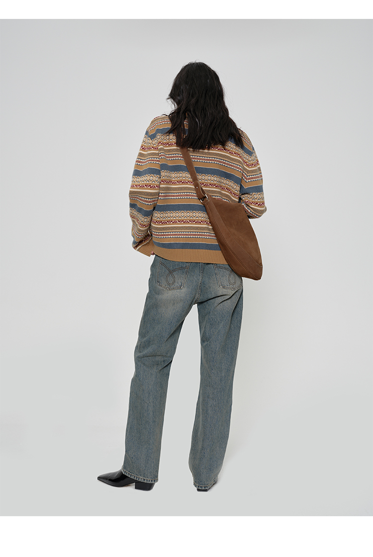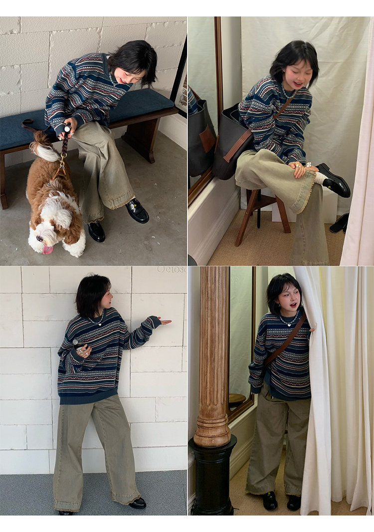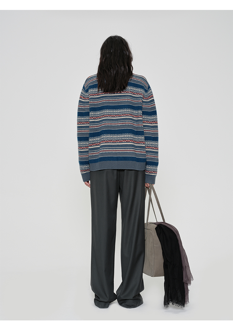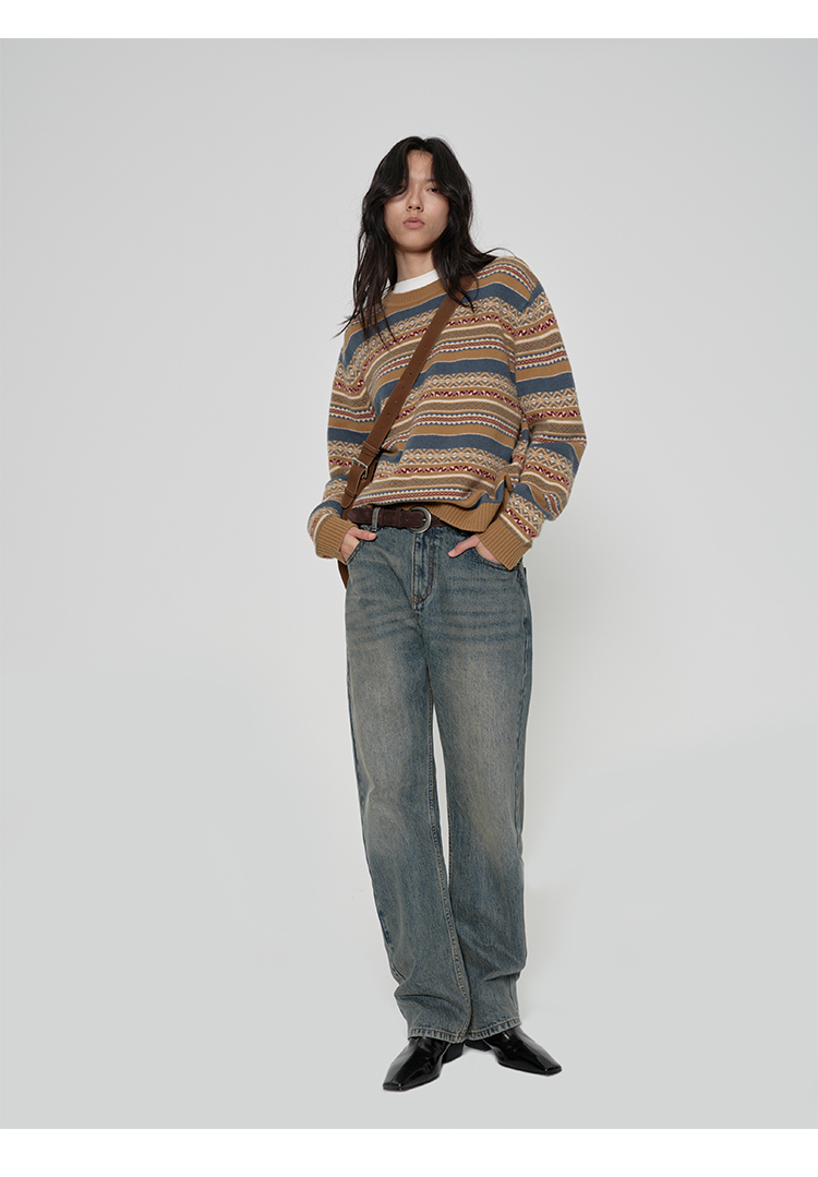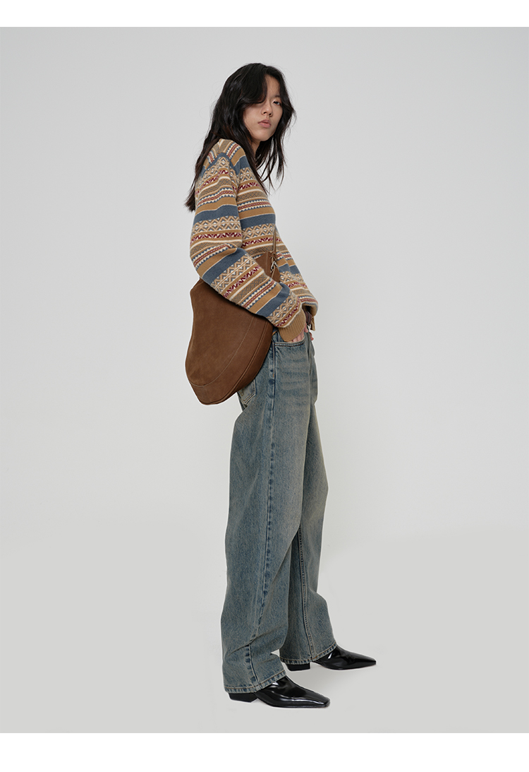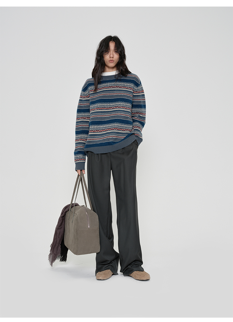 HIDEMI 【赵丽颖同款】进口澳洲美利奴羊毛手绘花型设计感极简圆领廓形落肩款长袖针织毛织毛衣 卡其色/蓝灰色/灰紫色