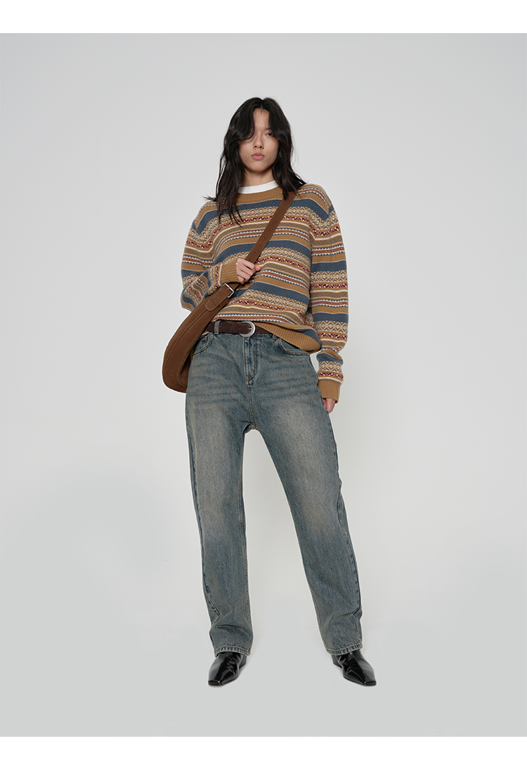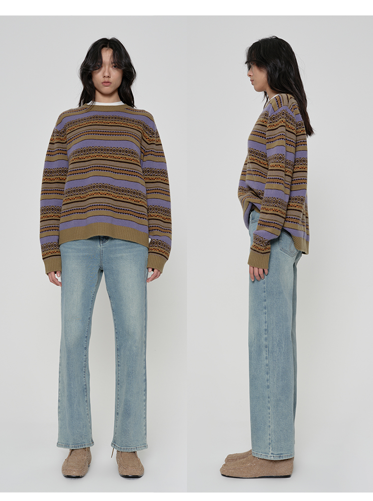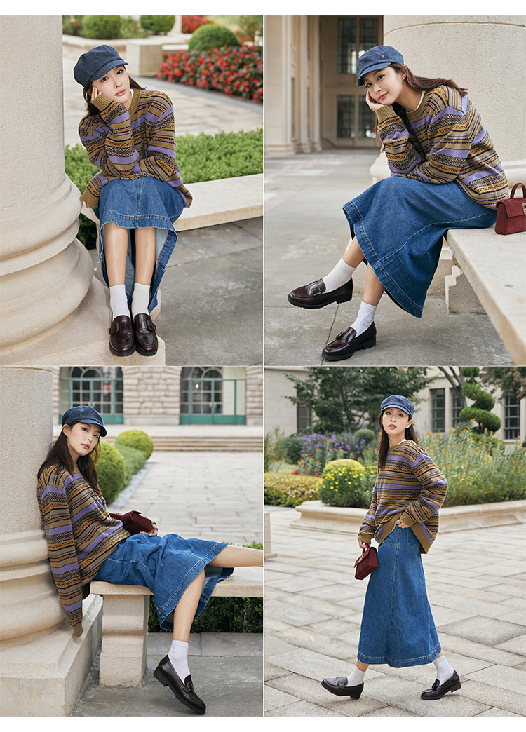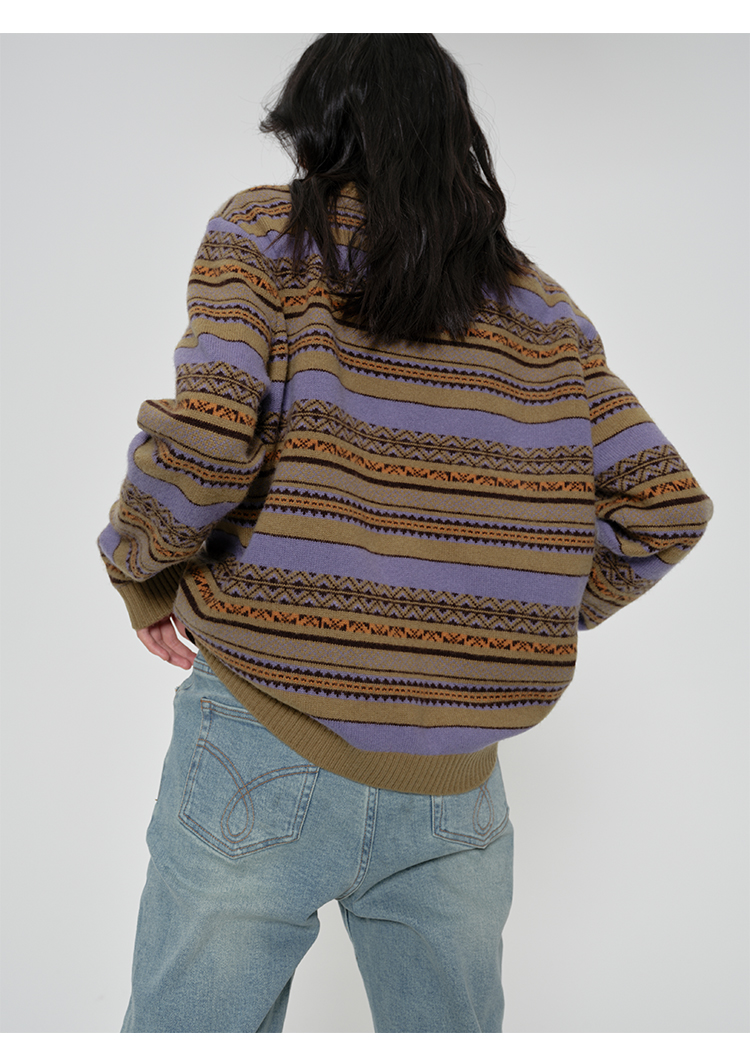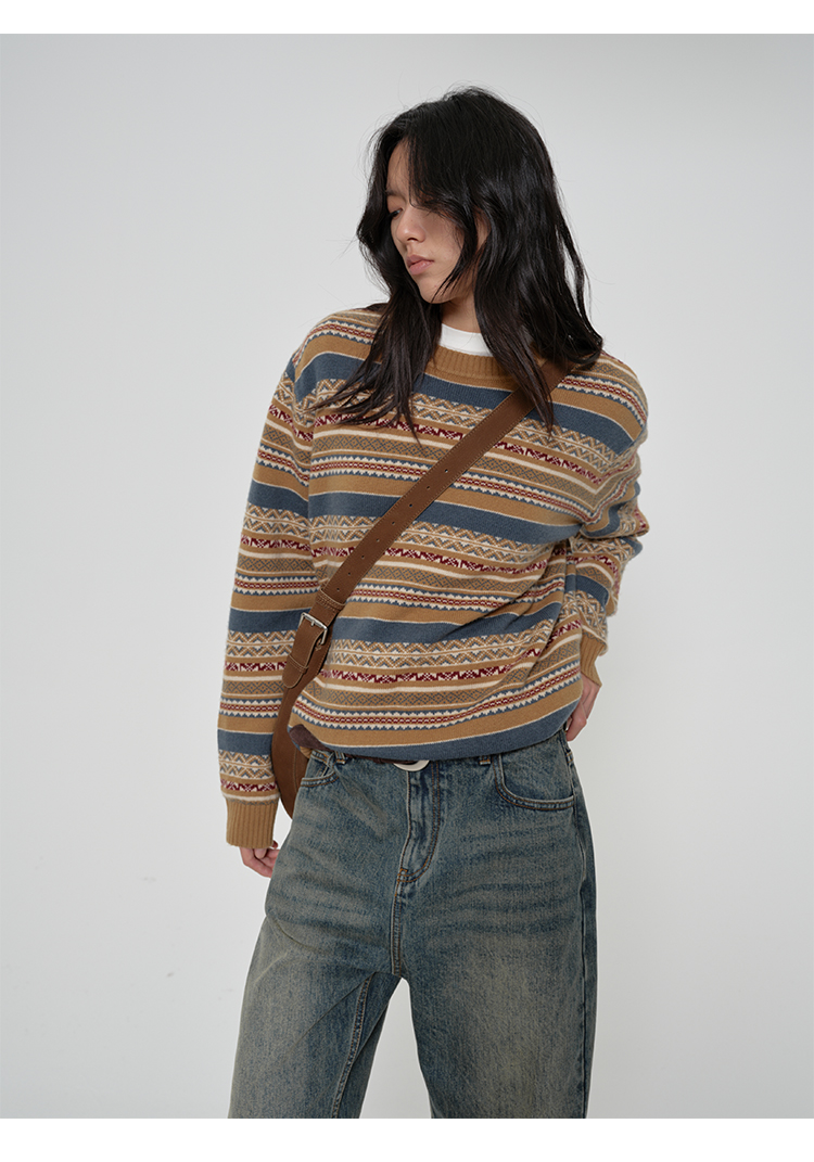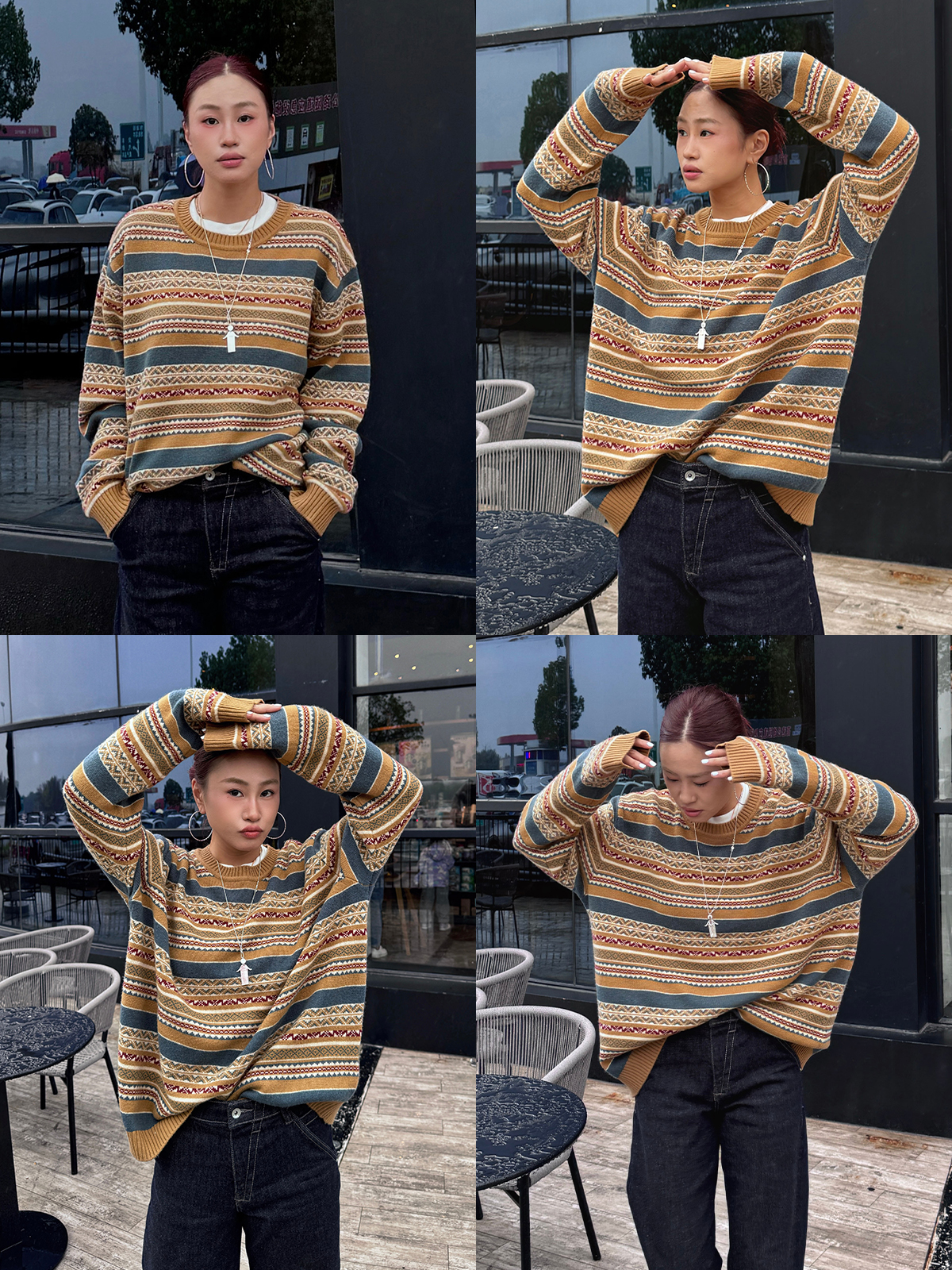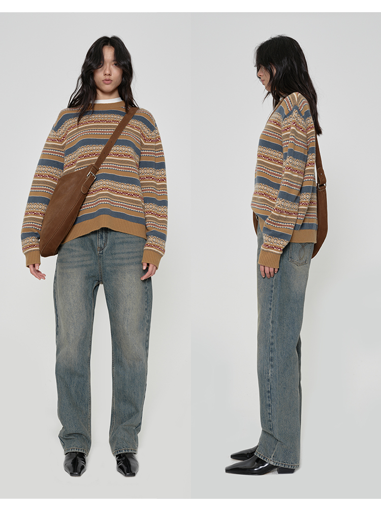 HIDEMI 【赵丽颖同款】进口澳洲美利奴羊毛手绘花型设计感极简圆领廓形落肩款长袖针织毛织毛衣 卡其色/蓝灰色/灰紫色