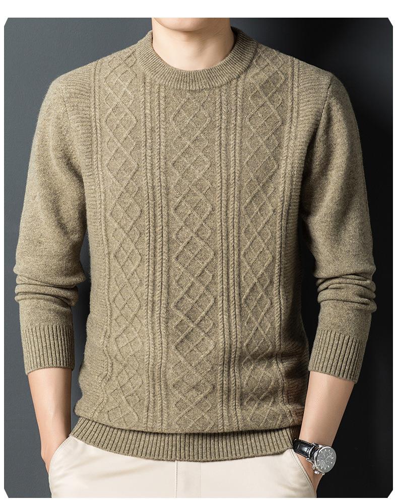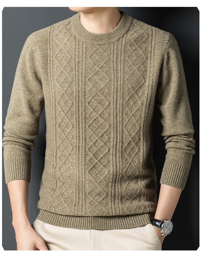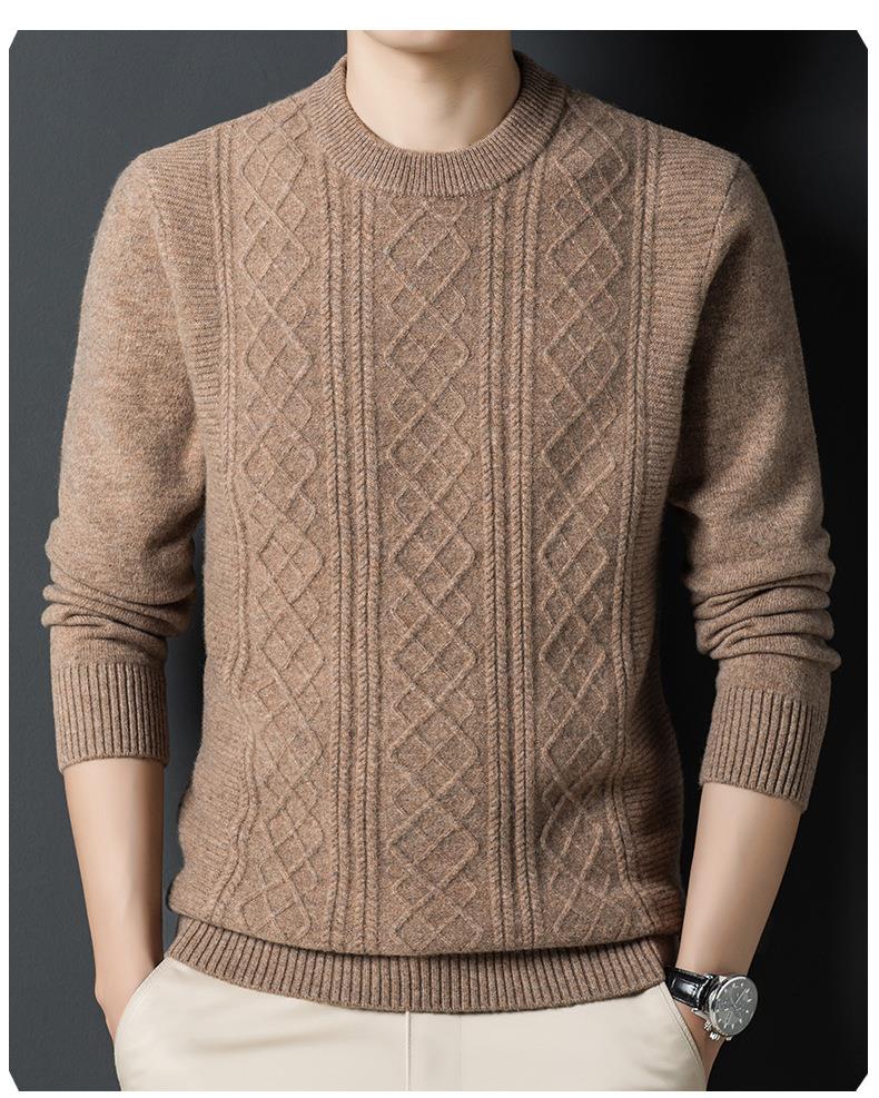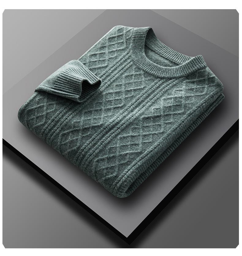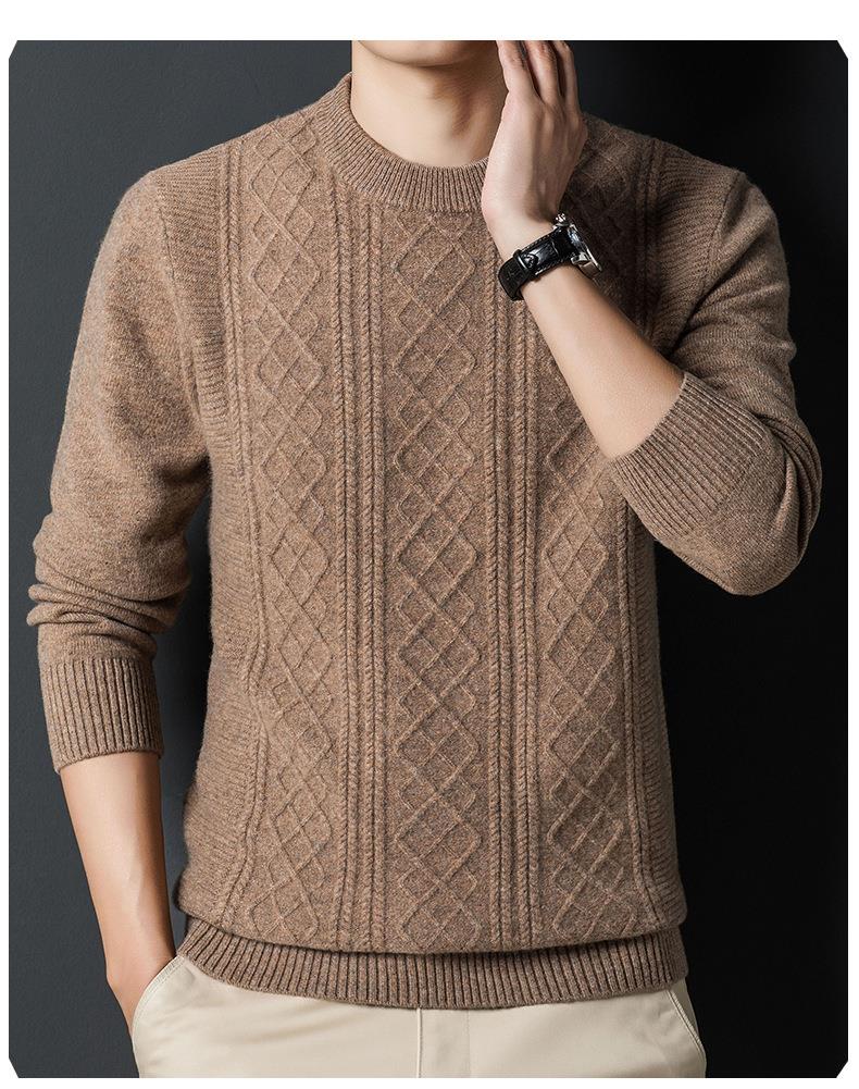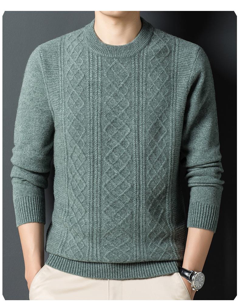 纯羊毛毛衣男士秋冬季新款圆领提花加厚保暖百搭打底羊毛衫男