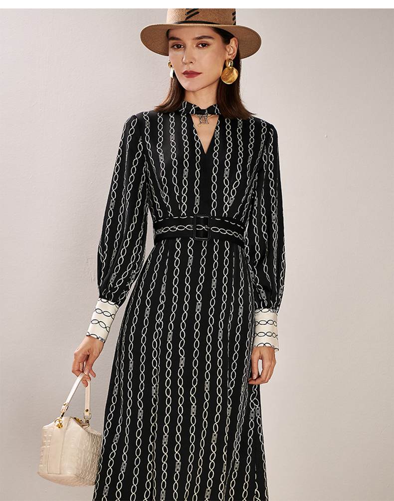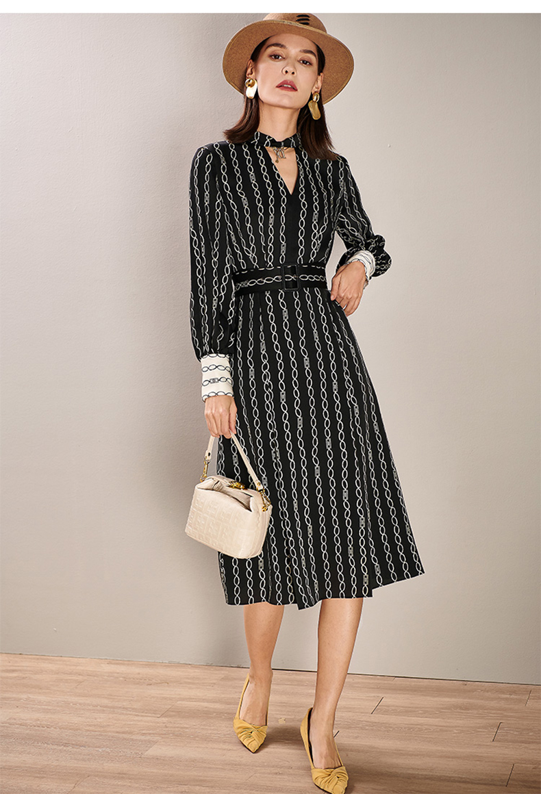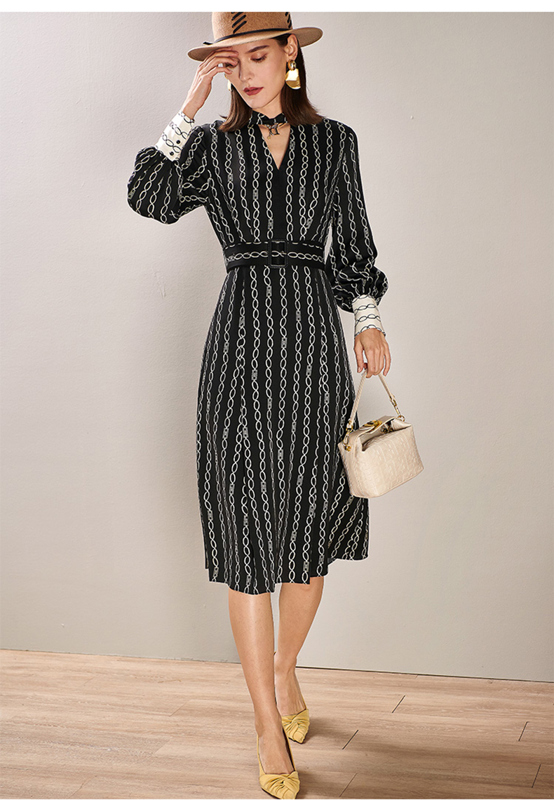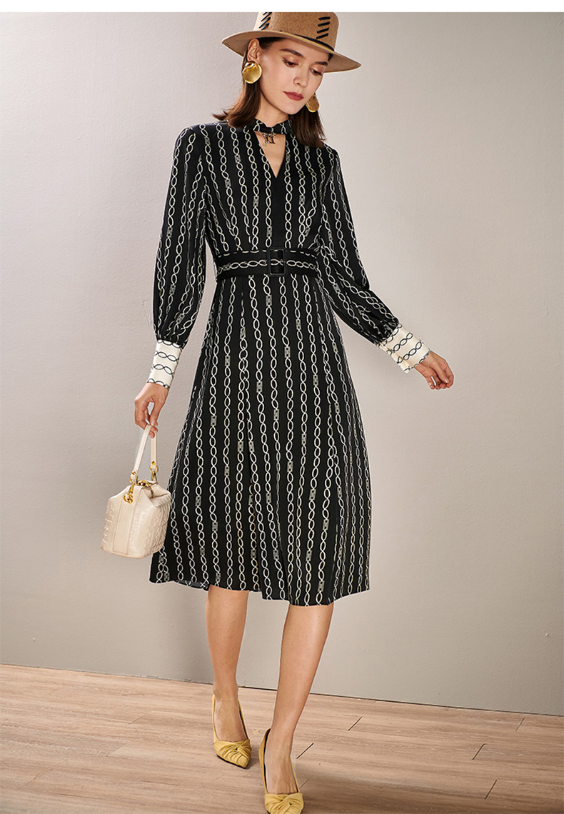 剩S 芳外春季新款潮流印花显瘦A字裙小心机V领袖口撞色连衣裙0105