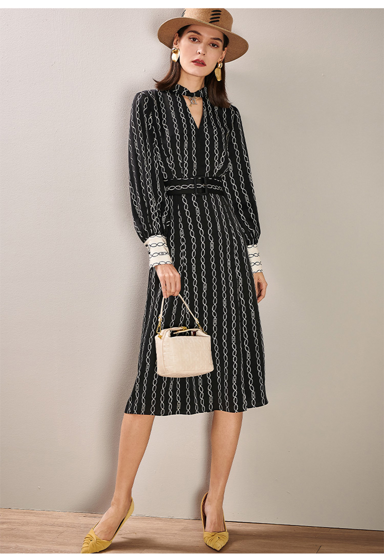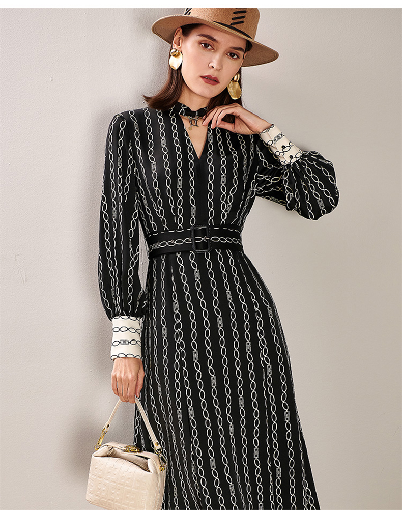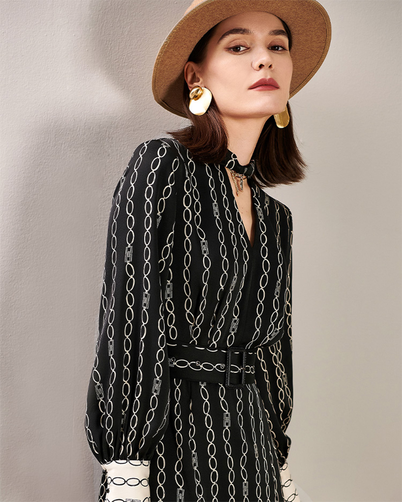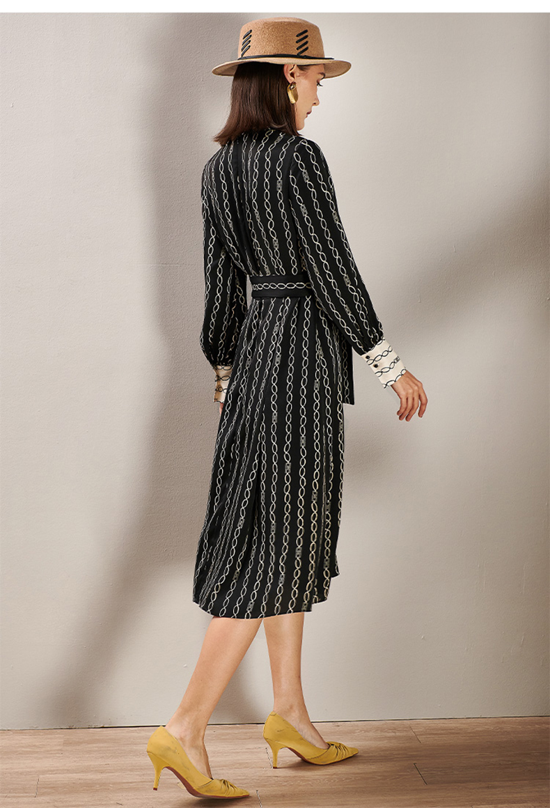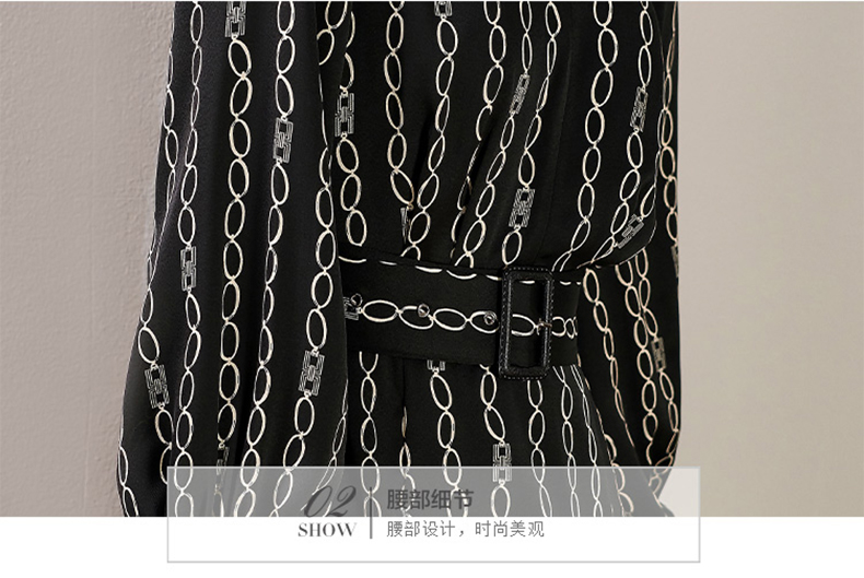剩S 芳外春季新款潮流印花显瘦A字裙小心机V领袖口撞色连衣裙0105