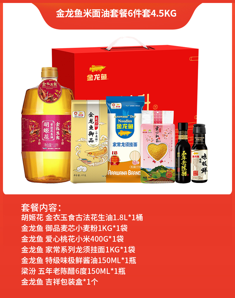 金龙鱼米油面组合(胡姬花锦衣玉食花生油1.8L*1 金龙鱼阳光葵花籽油1.8L*1 金龙鱼乳玉皇妃凝玉稻香贡米2.5kg*1 金龙鱼御品麦芯粉1kg*1 金龙鱼爱心桃花小米400g*1)