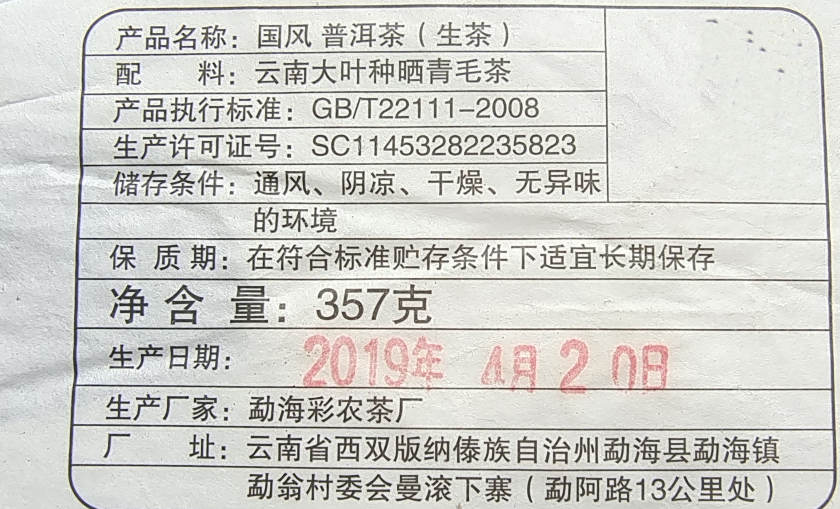 品名:彩农茶|易武国风2019春纯料石磨青饼