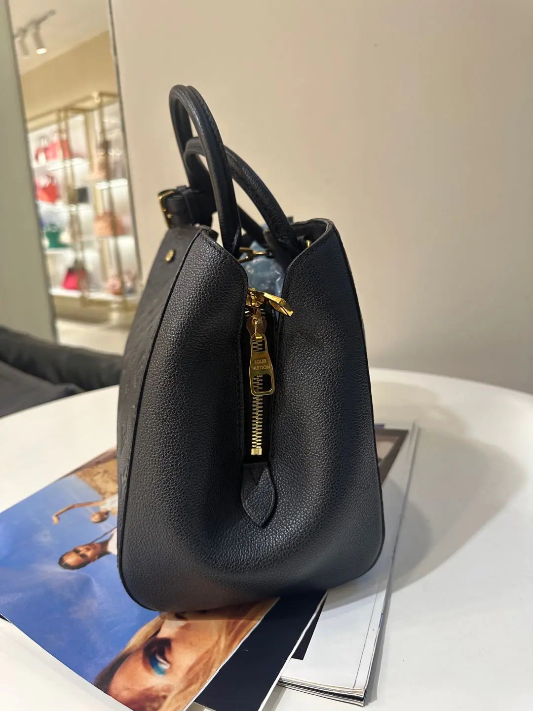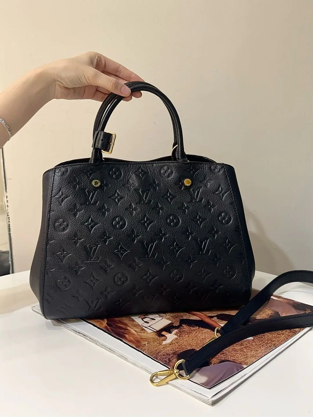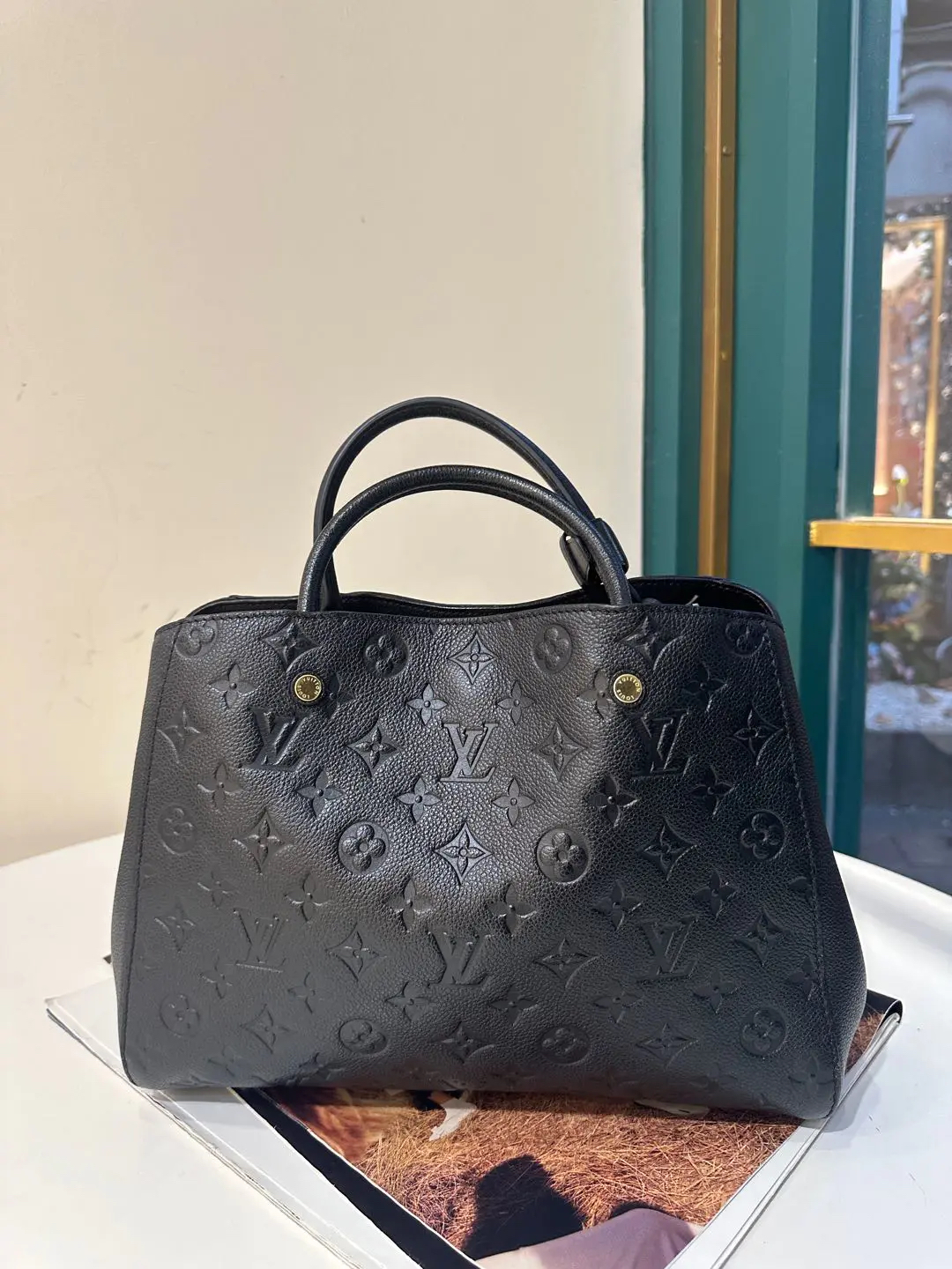 【商品详情】正品二手 LV 蒙田 中号 黑色 压纹牛皮 手提 单肩包🪄 95新 30x25 配件:肩带。金属正常使用感。低调内敛的美 黑色经典不过时🧸