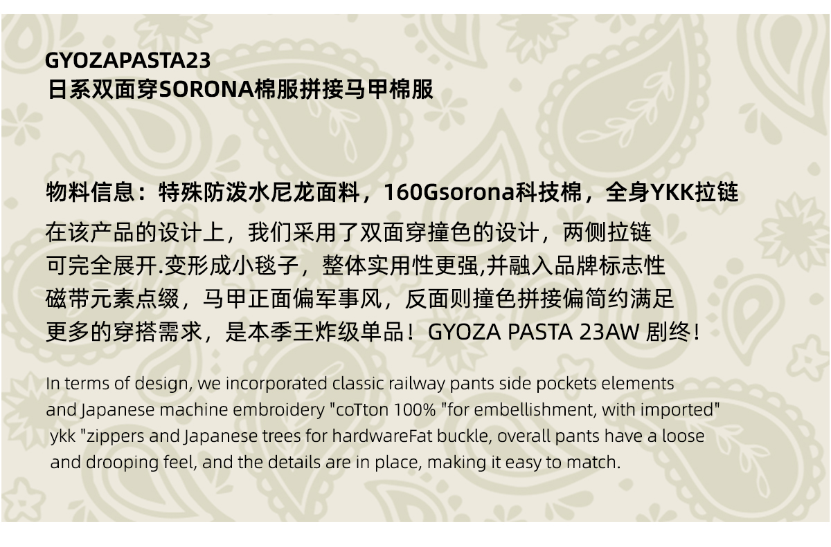 GYOZA PASTA/GP25AW-C057/棉两面穿棉服马甲外套男女
