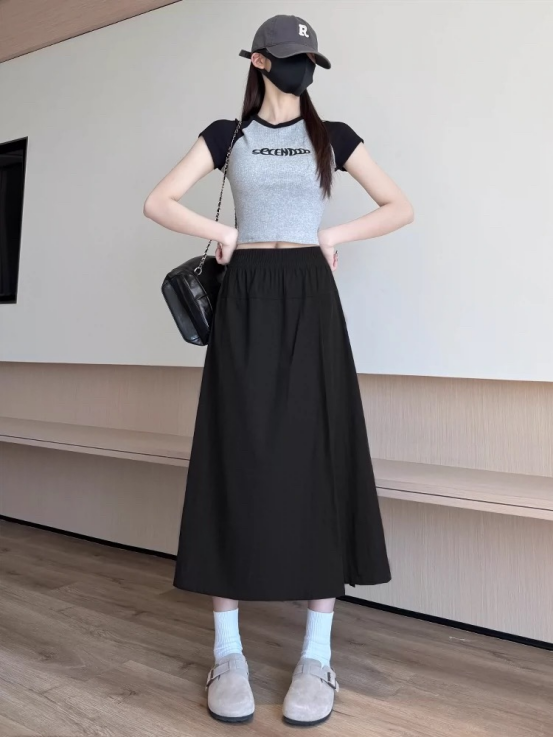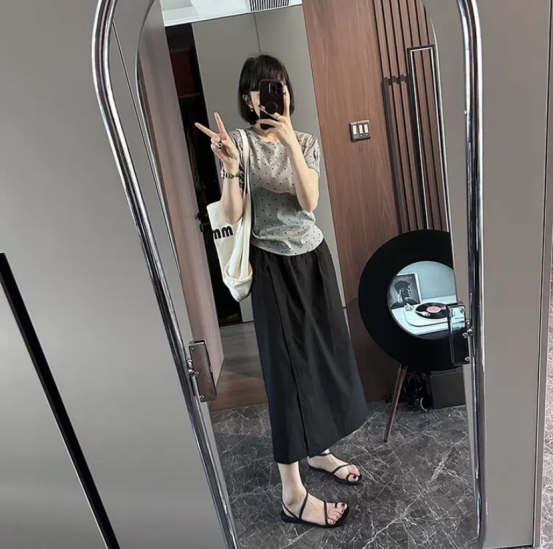 裙子前后都是斜裁的裙片拼接上身不单调 也并不会让裙子增加厚重感 正面侧面都很显瘦! 把小肚子也隐藏的很好 而且不显胯宽真的很藏肉很修饰身材! 长度也不挑人高个矮个全都能穿~