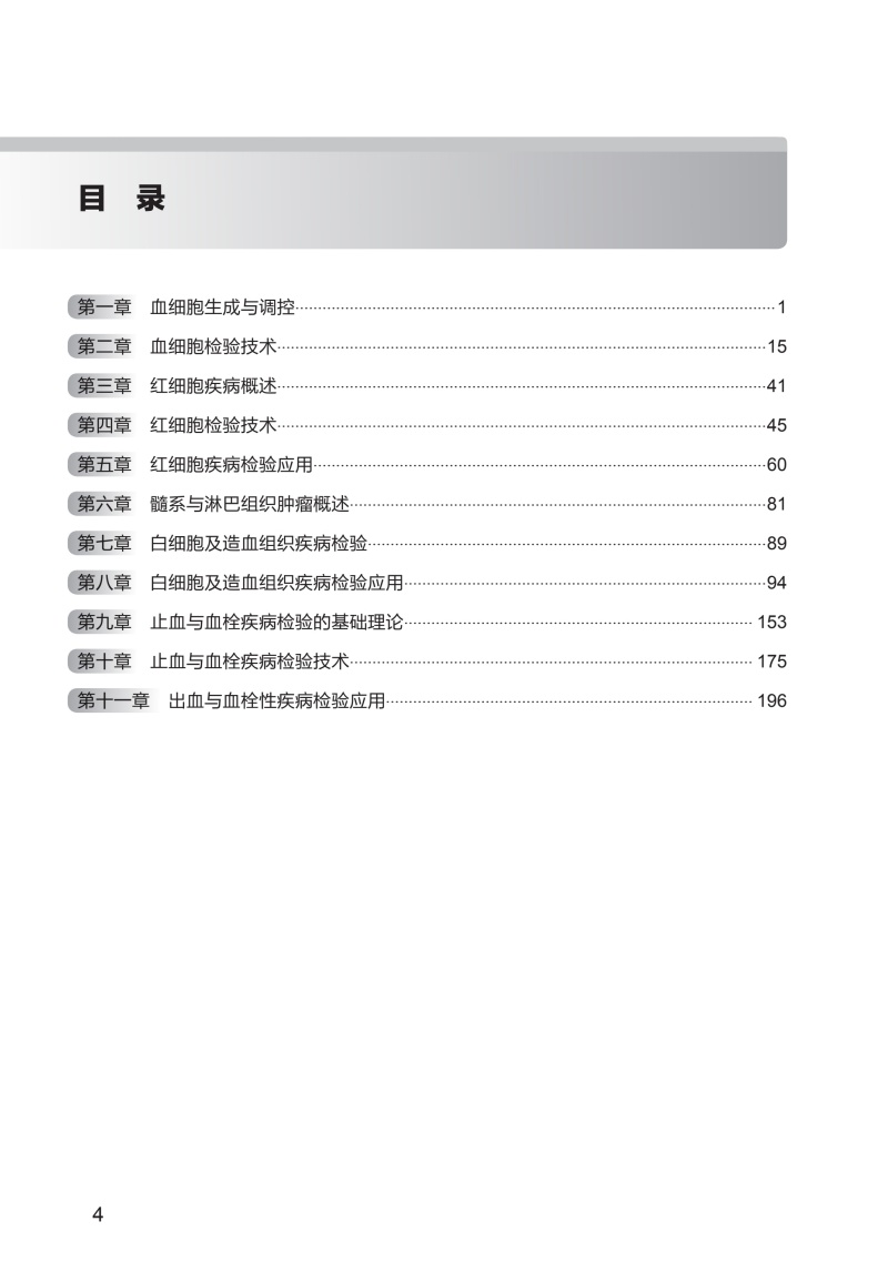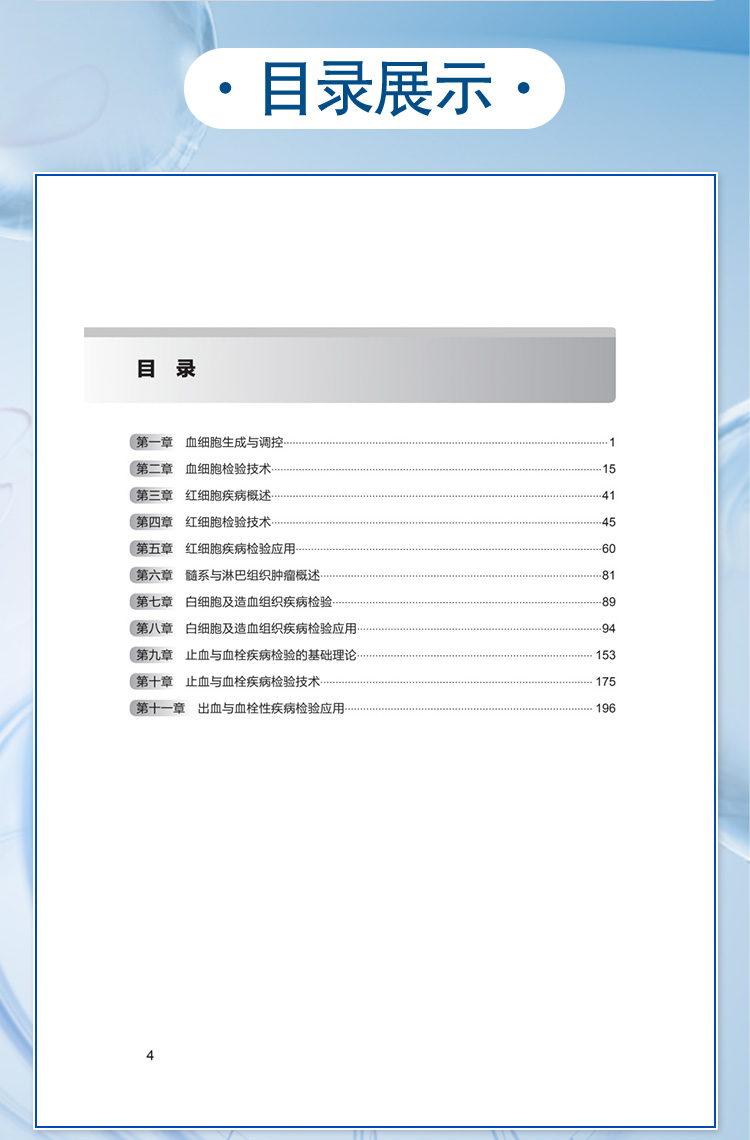 第一章 血细胞生成与调控/1 第二章 血细胞检验技术/15 第三章 红细胞疾病概述/41 第四章 红细胞检验技术/45 第五章 红细胞疾病检验应用/60 第六章 髓系与淋巴组织肿瘤概述/81 第七章 白细胞及造血组织疾病检验/89 第八章 白细胞及造血组织疾病检验应用/94 第九章 止血与血栓疾病检验的基础理论/ 153 第十章 止血与血栓疾病检验技术/ 175 第十一章 出血与血栓性疾病检验应用/ 196
