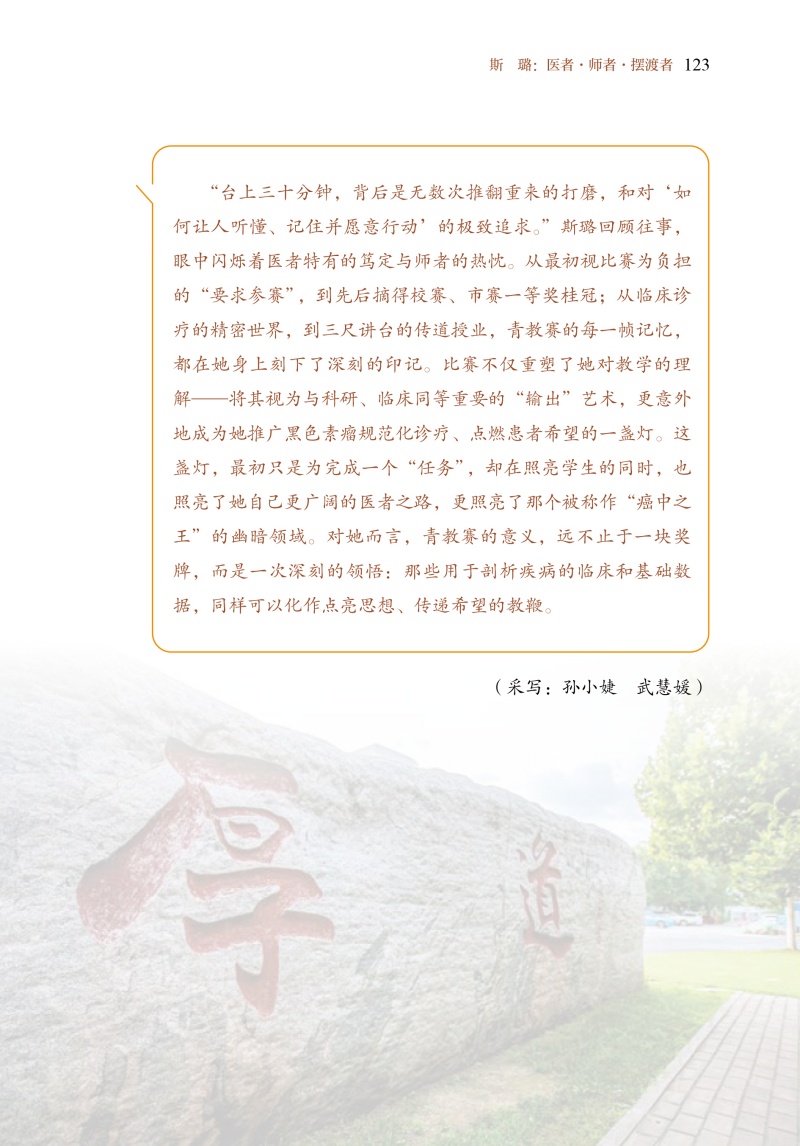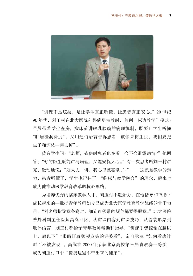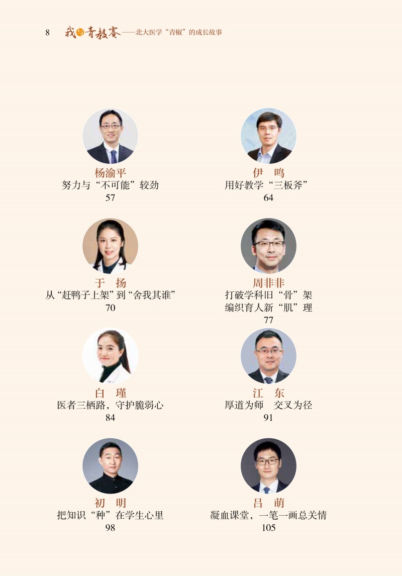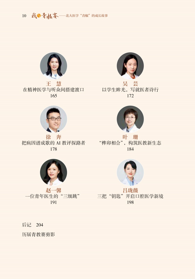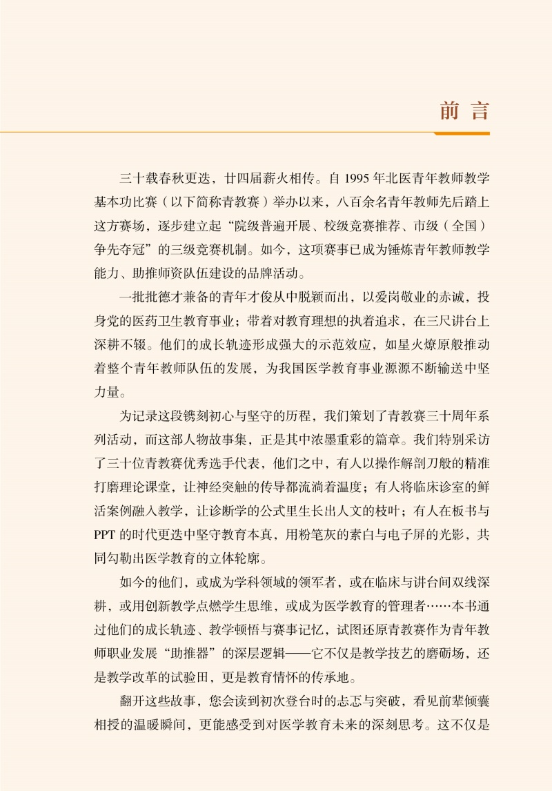 自1995年北医青年教师教学基本功比赛(以下简称青教赛)举办以来,历届参赛人数达800余人,逐步建立了院级普遍开展、校级竞赛推荐、市级(全国)争先夺冠三级竞赛机制,成为提高青年教师教学水平,促进青年教师队伍建设的一项品牌活动。通过青教赛,一批批德才兼备、能力出众的青年教师脱颖而出,为我国医学教育事业培养了大量人才。本书通过记录他们的成长故事、教学感悟与赛事记忆,试图还原青教赛如何成为青年教师职业发展的“助推器”——不仅是教学技艺的磨砺场,也是教学改革的试验田,更是教育情怀的传承地。这本书,不仅是选手个人成长的珍贵印记,更是青教赛三十年辉煌成就的生动缩影。