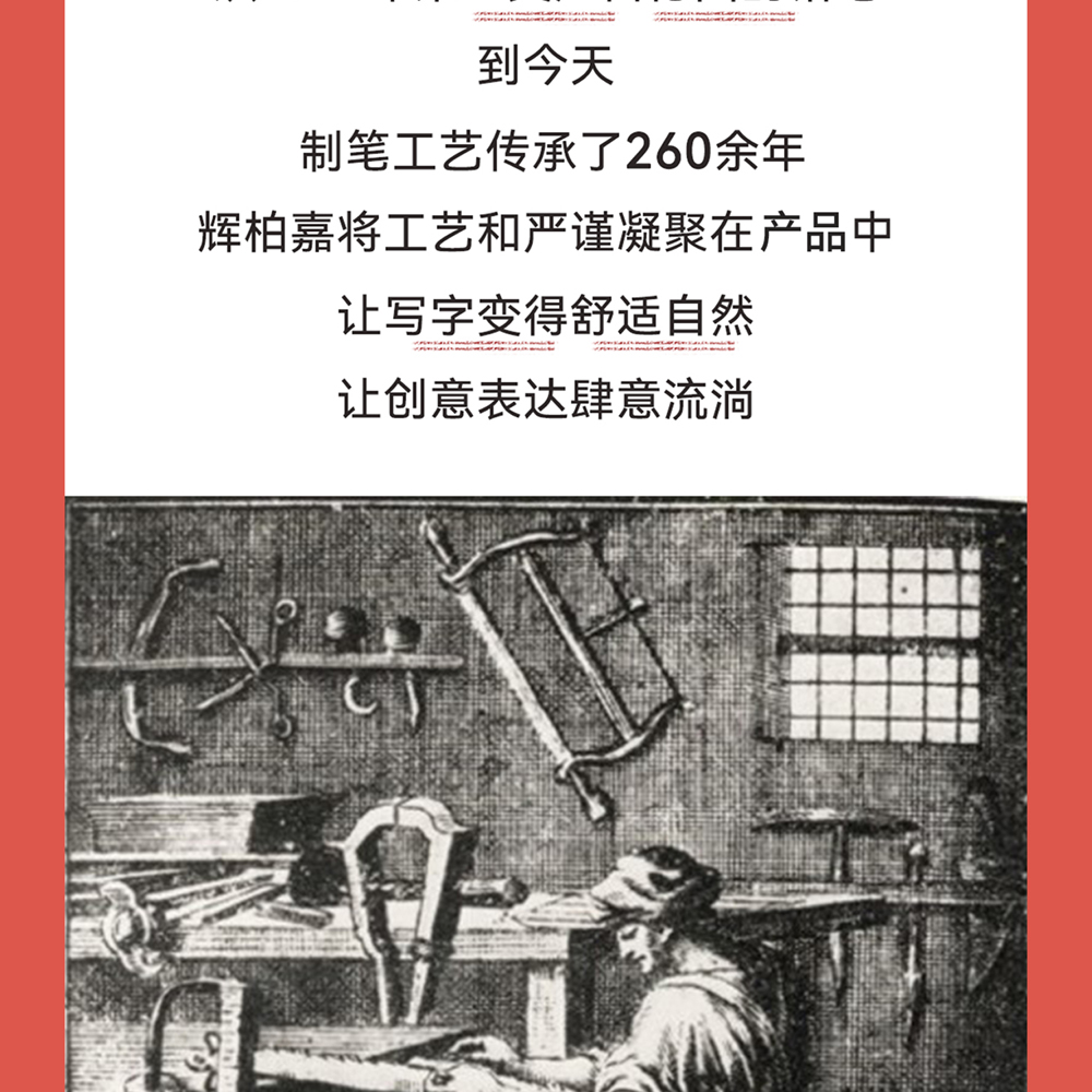 - 德国辉柏嘉,始创于1761年的家族品牌,历经259年岁月洗礼的制笔权威,一直致力于提供高品质书写及绘画艺术创作工具的专业制造商。