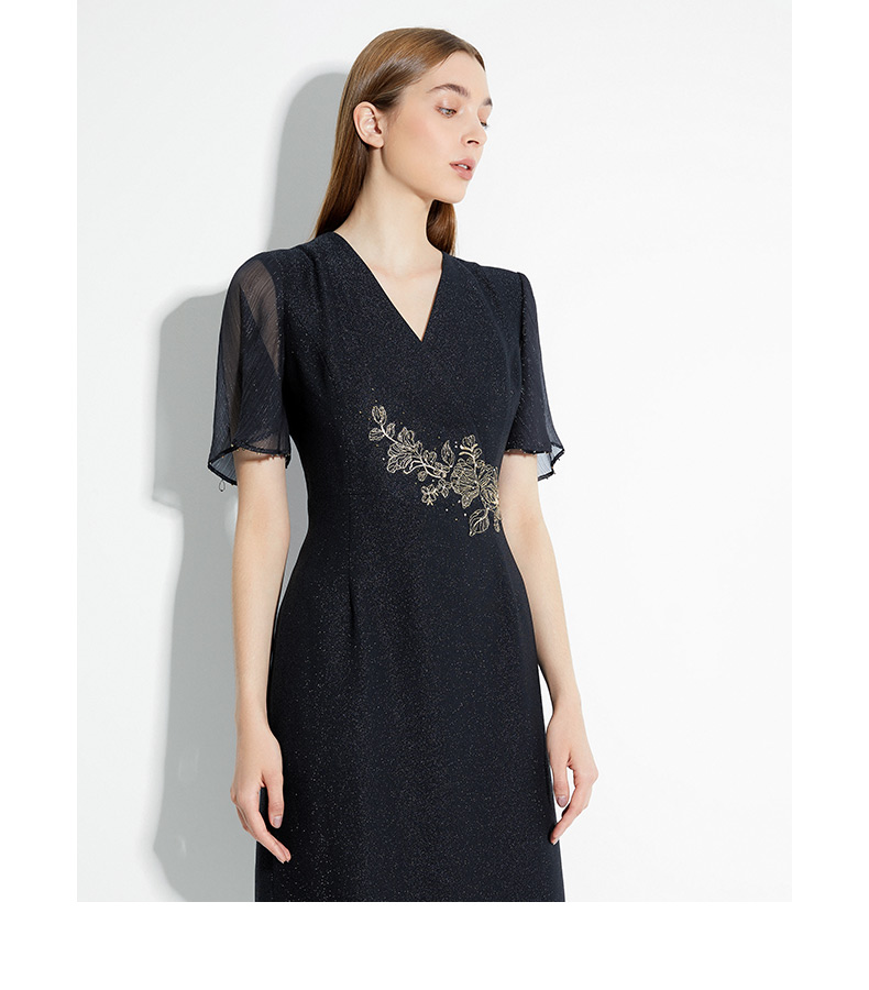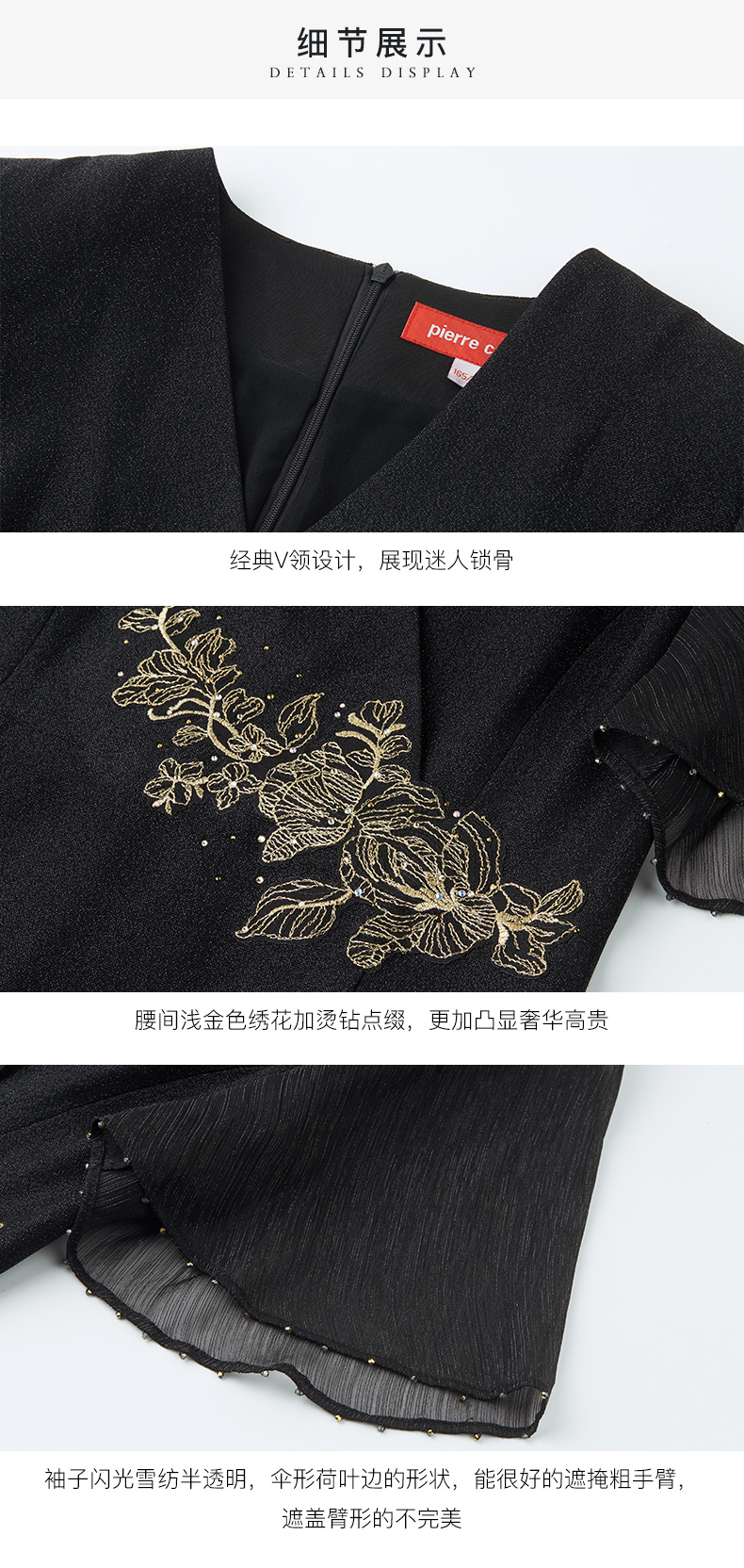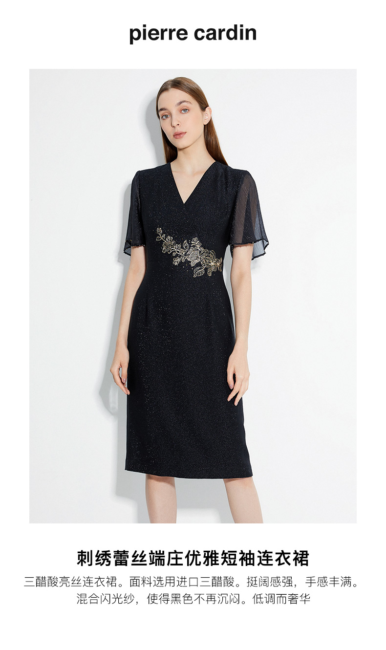 皮尔卡丹女季新款蓝色短袖V领连衣裙纯色包臀裙P0217DS27N0