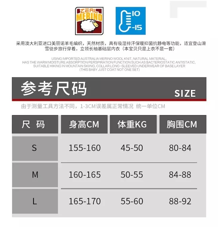 ZEALWOOD赛乐 女款保暖 舒爽 超细美丽诺羊毛 200G中厚 半拉链式内衣