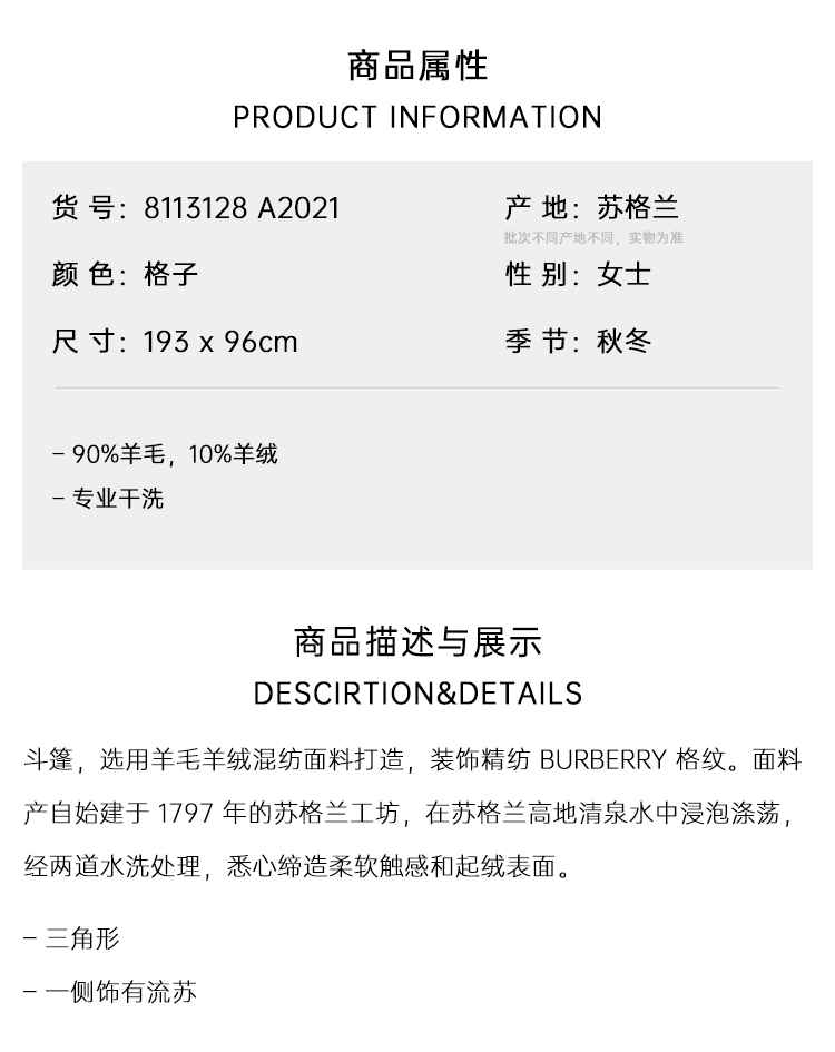 BURBERRY 巴宝莉 女士格纹羊毛羊绒混纺斗篷 格子 8113128 A2021