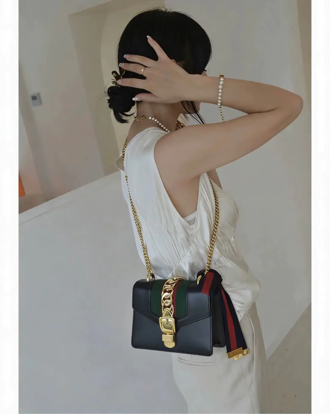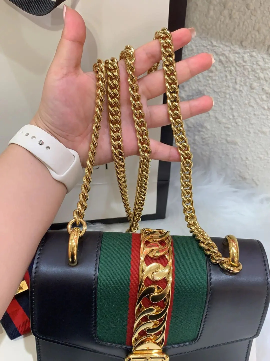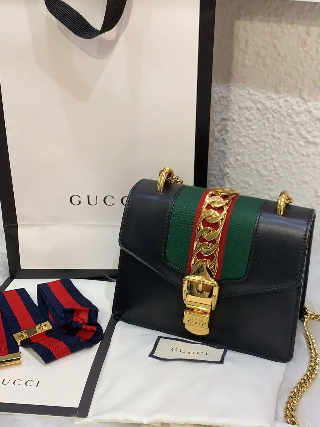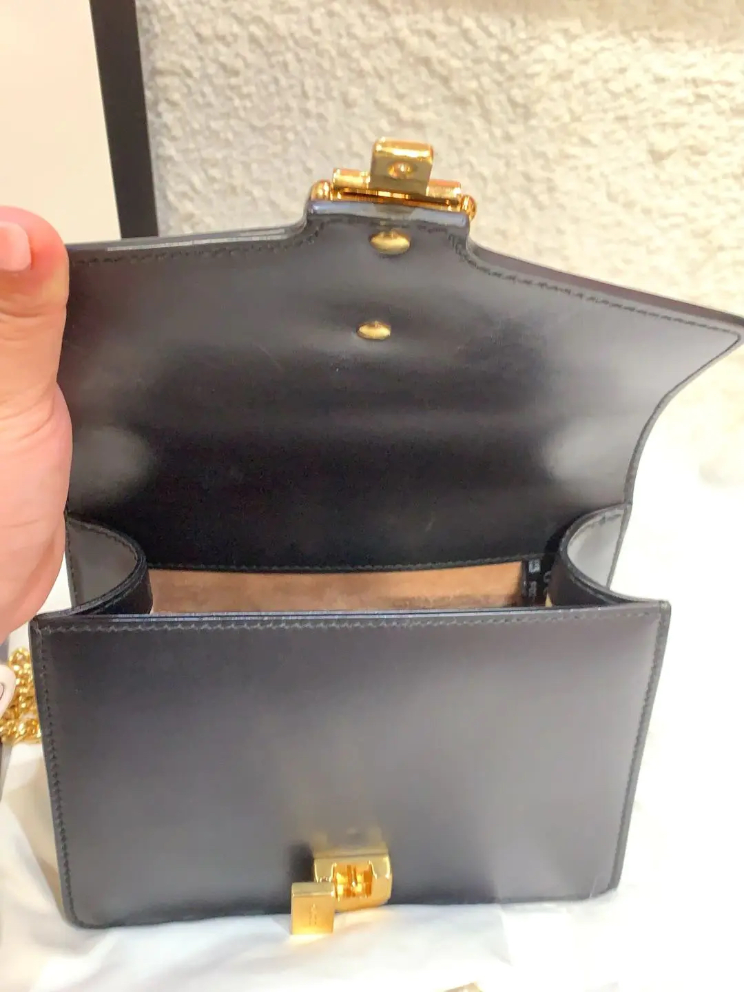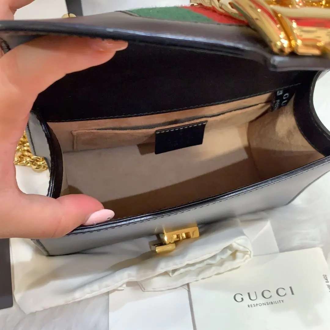 【商品详情】正品二手 Gucci 塞尔维亚 黑色 box皮 小号 斜挎包 🖤95新 18×12 配件:说明书 肩带 防尘袋。包身和内翻盖有正常使用划痕。喜欢box牛皮的不要错过!黑金奢华百搭