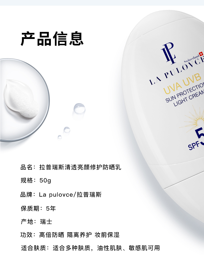 LaPulovce拉普瑞斯瑞士白鸡蛋防晒霜清爽倍护防水防晒霜50g