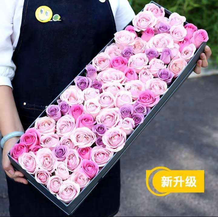 花材:22支粉玫瑰,22支戴安娜玫瑰,22支紫玫瑰,60cm礼盒