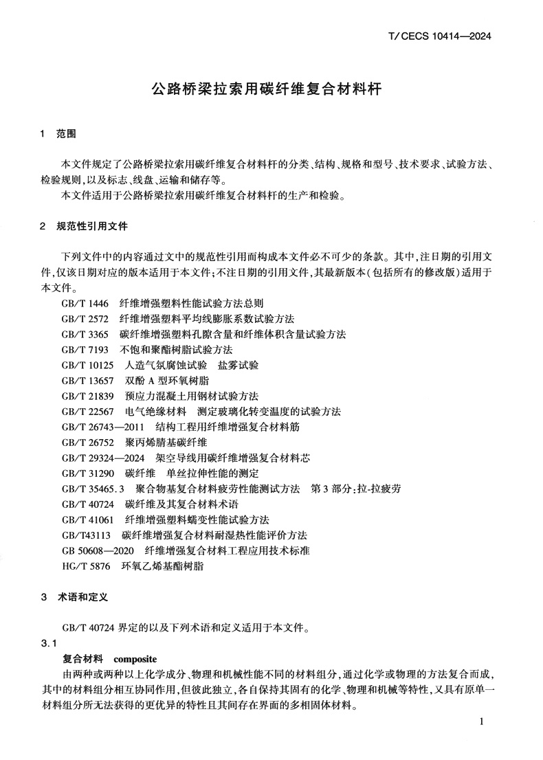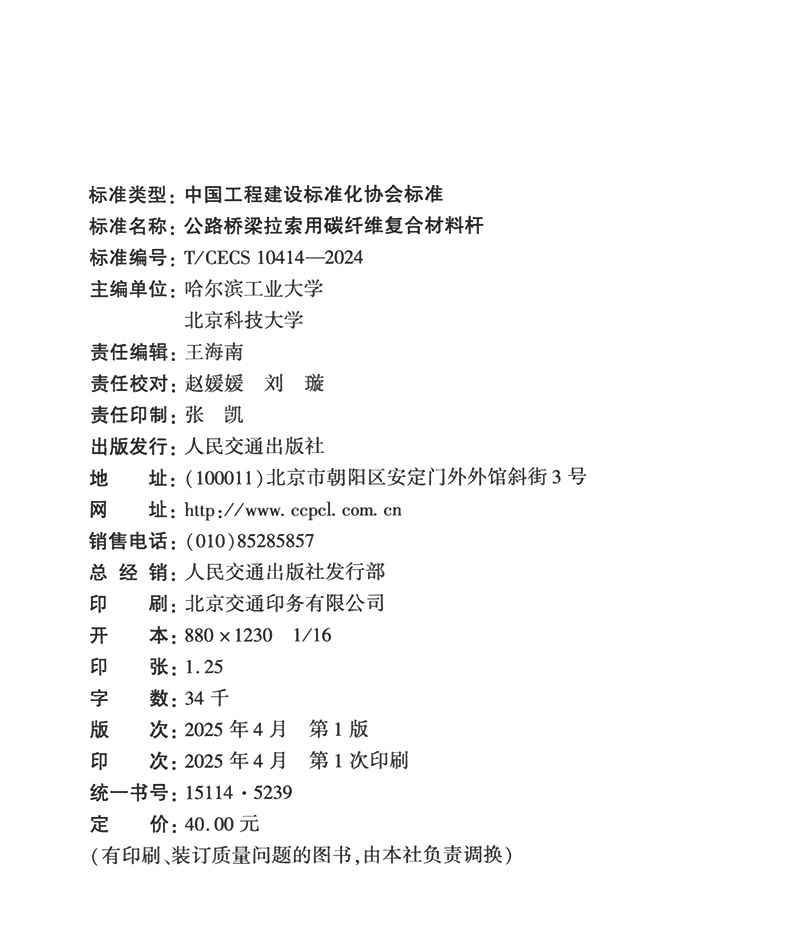 书名:公路桥梁拉索用碳纤维复合材料杆(T/CECS 10414—2024)