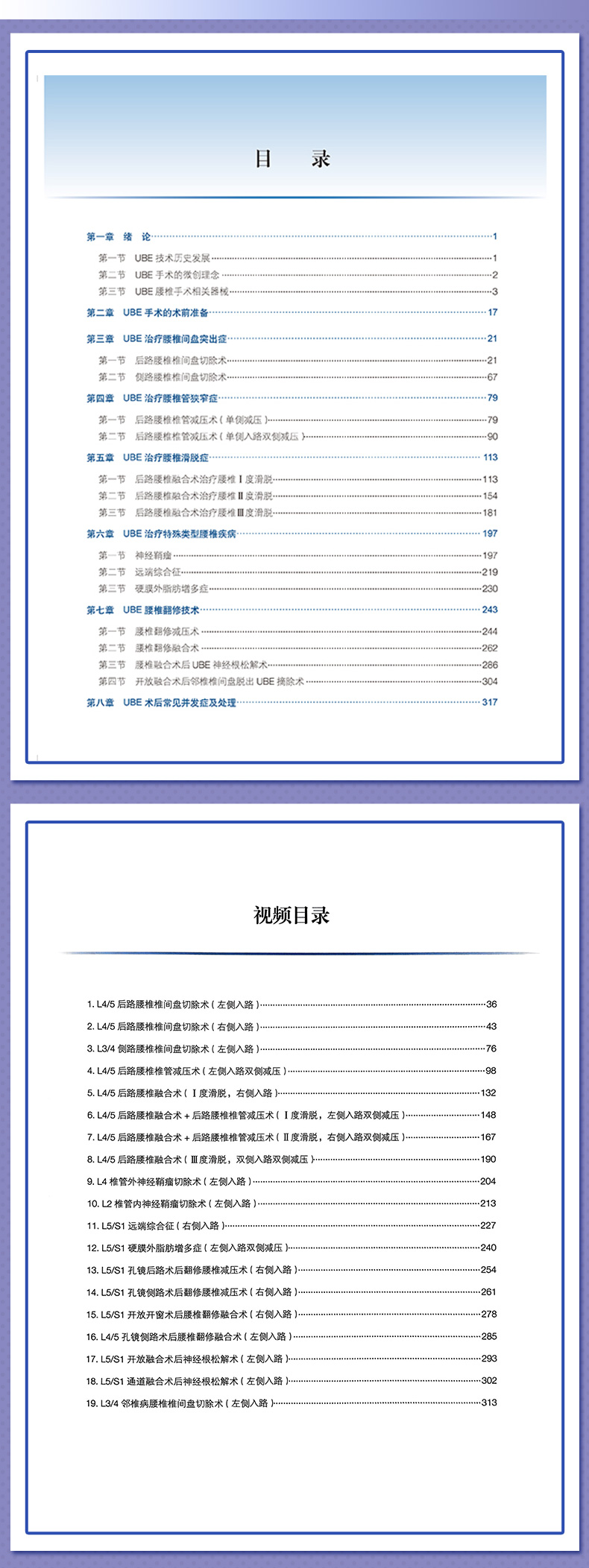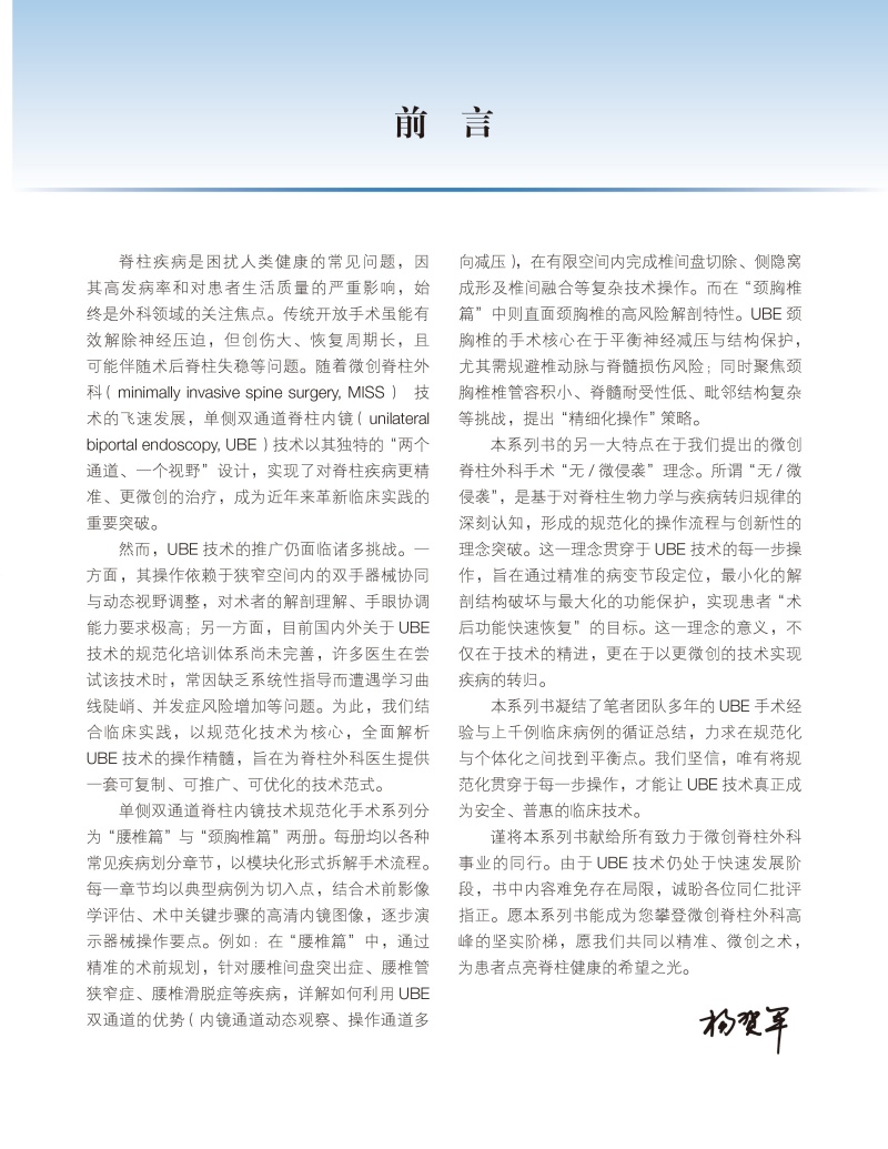 单侧双通道技术内镜技术是近年来快速发展的脊柱微创技术。丛书分为腰椎篇与颈胸椎篇两册。本书为腰椎篇。每册均以各种常见疾病划分章节,以“模块化”形式拆解手术流程。每一章节均以典型病例为切入点,结合术前影像学评估、术中关键步骤的高清内镜图像,逐步演示器械操作要点。例如:在腰椎篇中,通过精准的术前规划,针对腰椎间盘突出症、腰椎管狭窄症、腰椎滑脱等疾病,详解如何利用UBE双通道的优势(内镜通道动态观察、操作通道多向减压),在有限空间内完成椎间盘切除、侧隐窝成形及椎间融合等复杂技术操作。而在颈胸椎篇中则直面颈胸椎的高风险解剖特性。UBE颈胸椎的手术核心在于平衡神经减压与结构保护,尤其需规避椎动脉与脊髓损伤风险;同时聚焦颈胸椎椎管容积小、脊髓耐受性低、毗邻结构复杂等挑战,提出“精细化操作”策略。