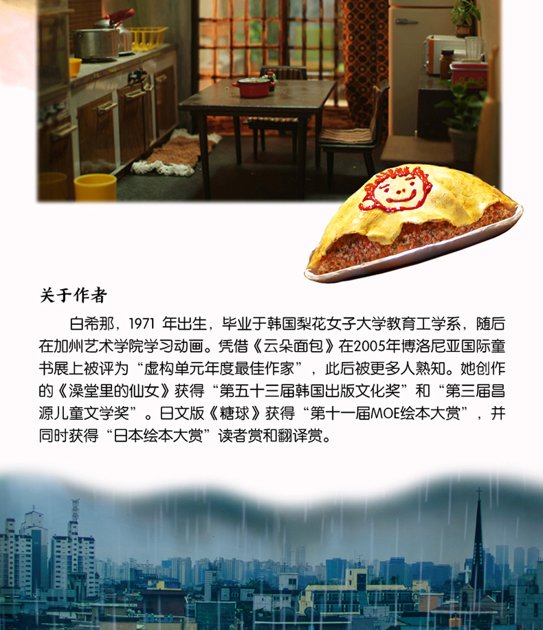 白希那 1971 年出生,韩国著名图画书作家,韩国第1位荣获韩国出版奖、意大利博洛尼亚国际童书展“年度文学类插图奖”的图画书作家。韩国梨花女子大学教育工学系毕业,现专职从事童书创作,致力于引发儿童兴趣的、兼具个性的图画书创作。《云朵面包》用纸雕的技法生动地描绘出了一个雨天的想象故事,曾在 2005 年博洛尼亚国际儿童书展上获得“年度文学类插画奖”。2012年她创作的《澡堂里的仙女》获得韩国出版奖“第五十三届韩国出版文化奖”,这是这个奖第1次颁发给图画书作品。