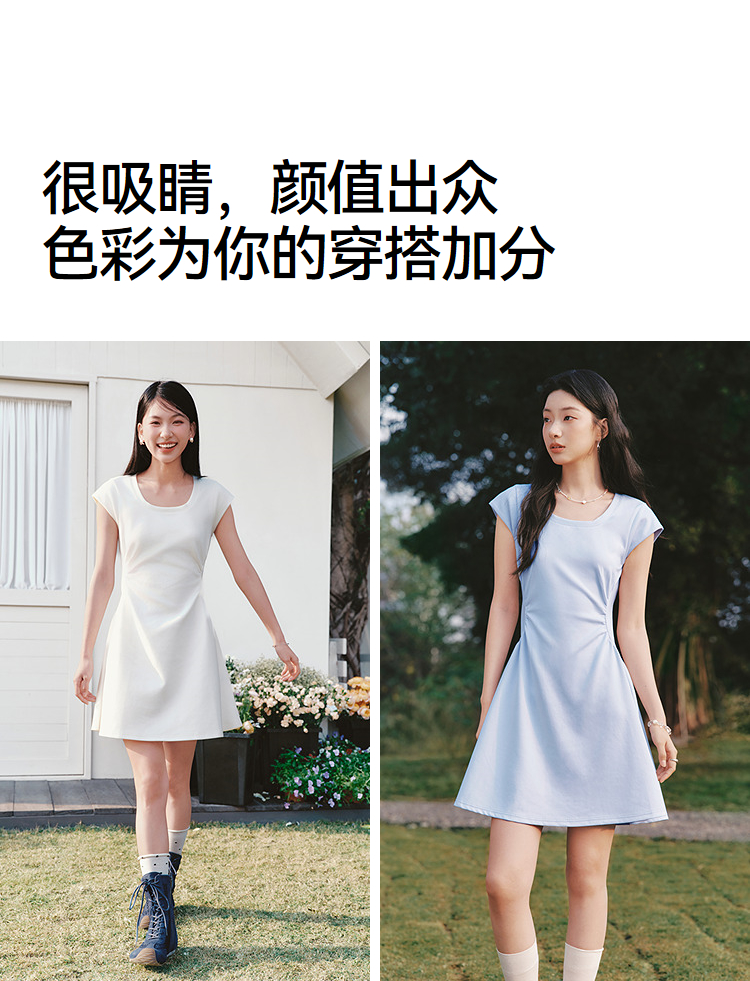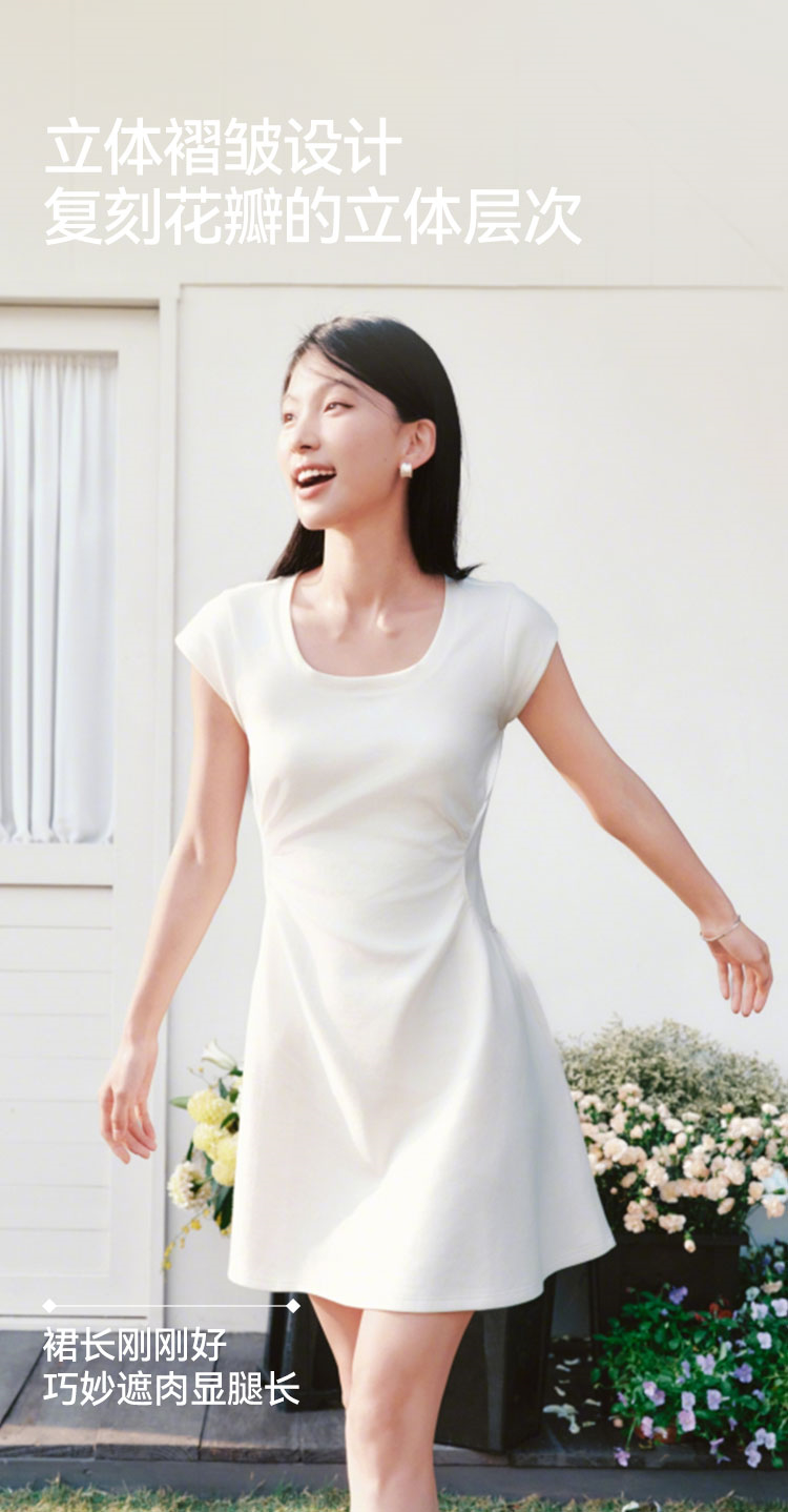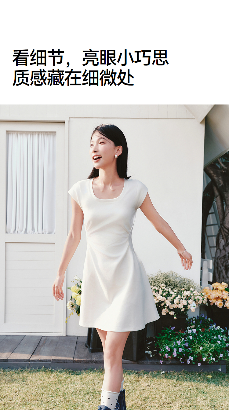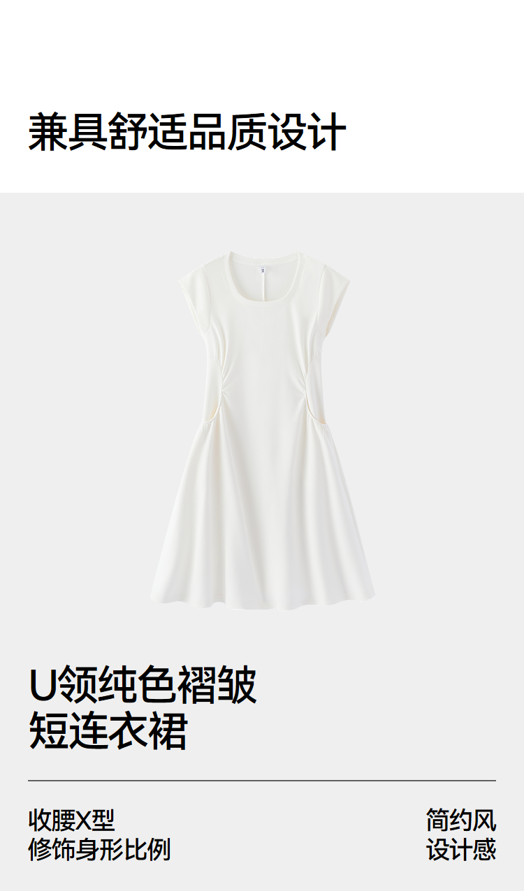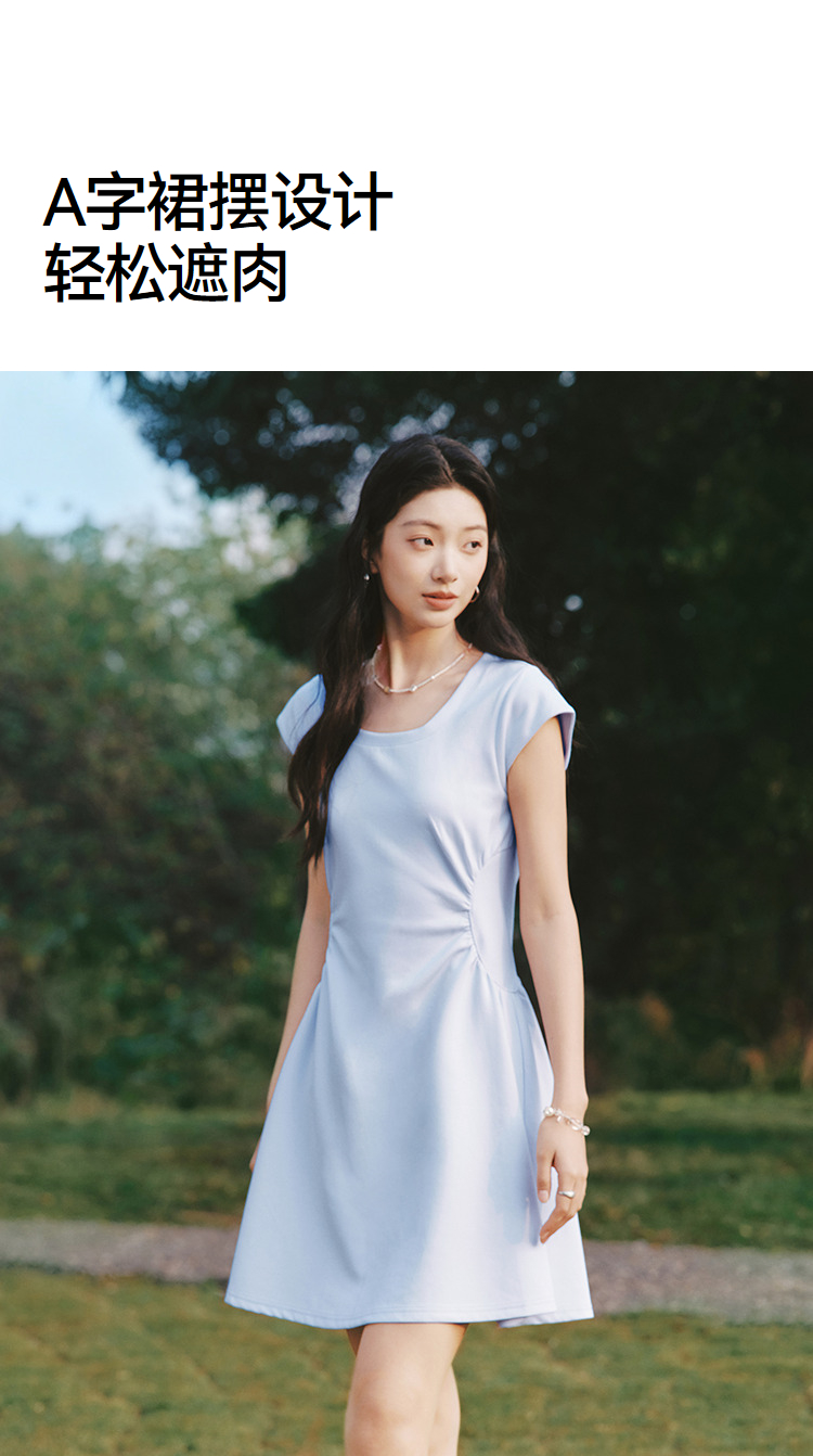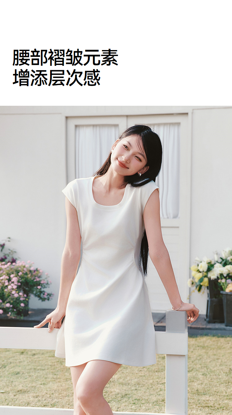 森马连衣裙女夏季U领纯色褶皱短袖短裙2026新款简约风设计感裙子