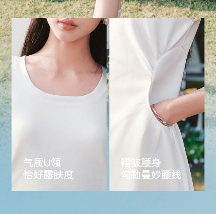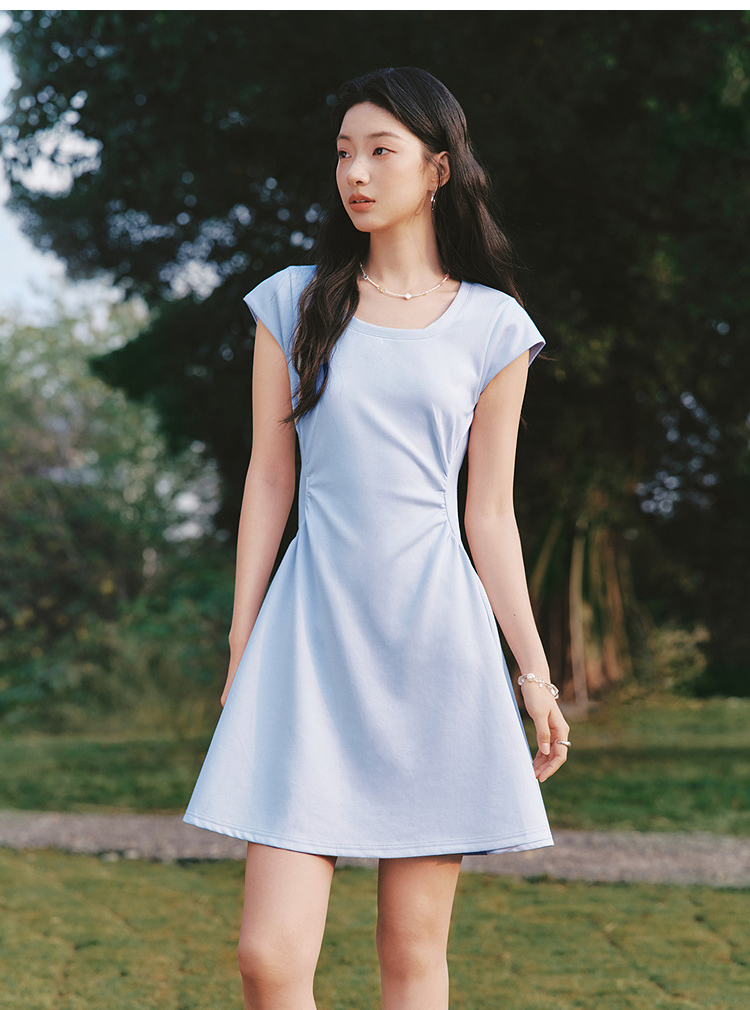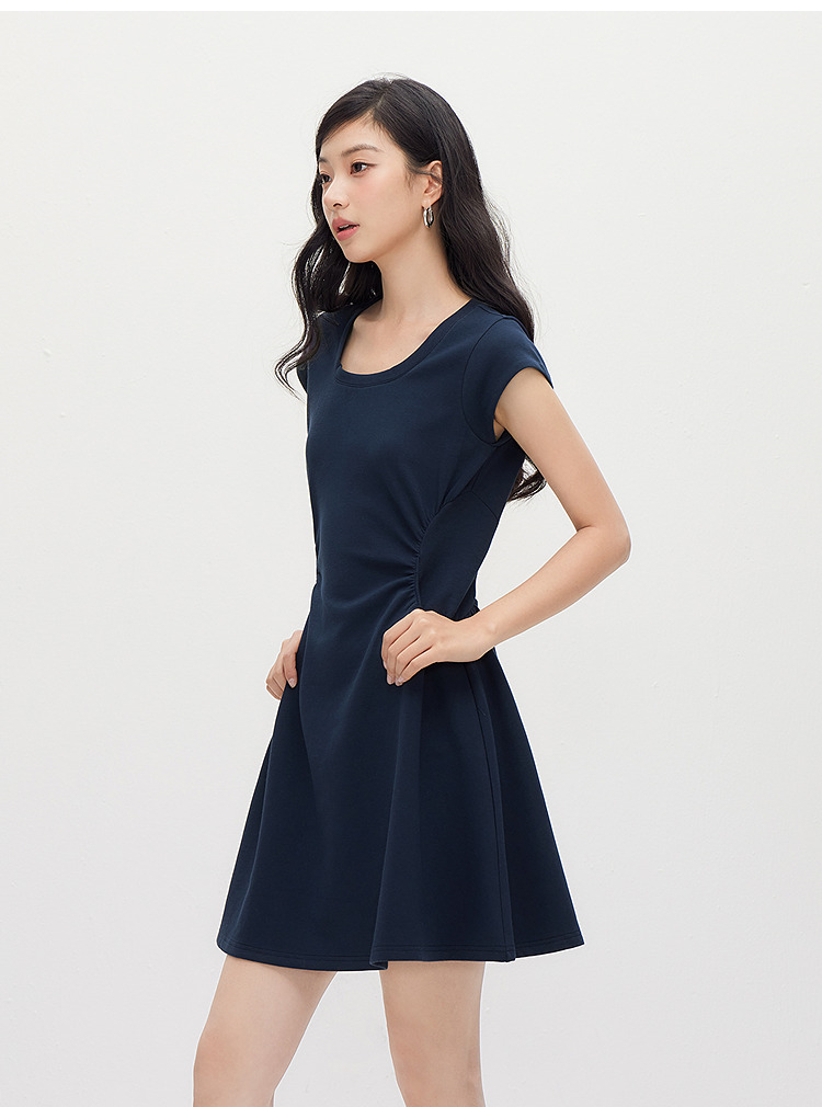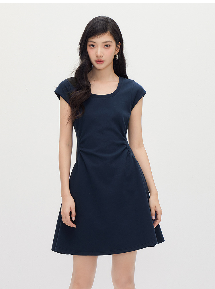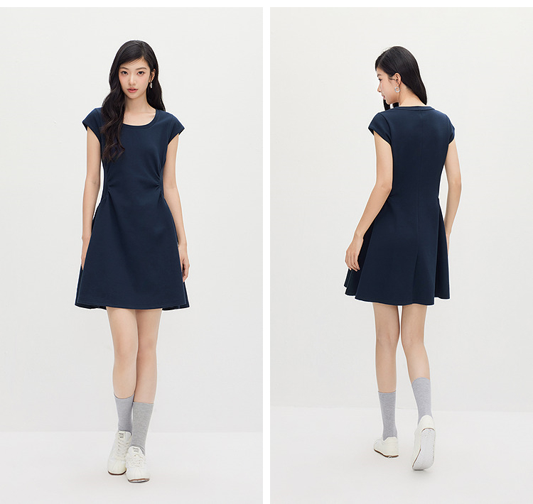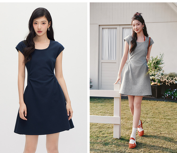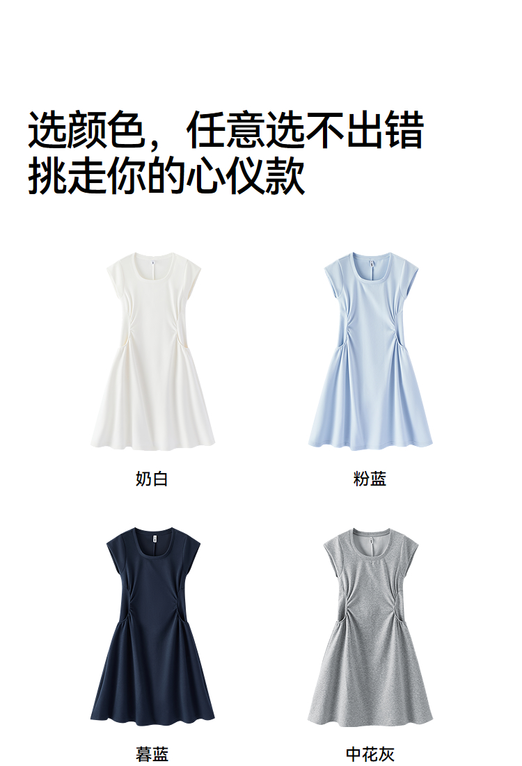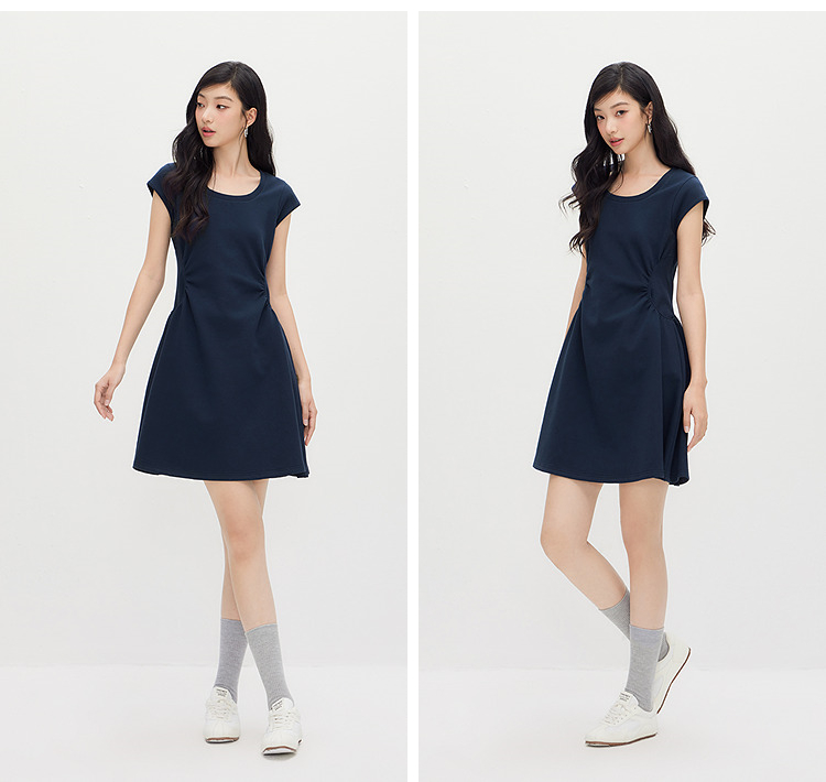 森马连衣裙女夏季U领纯色褶皱短袖短裙2026新款简约风设计感裙子