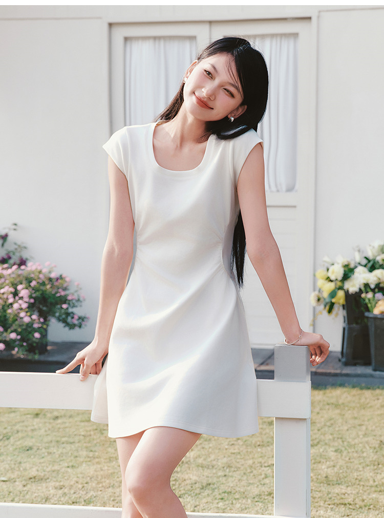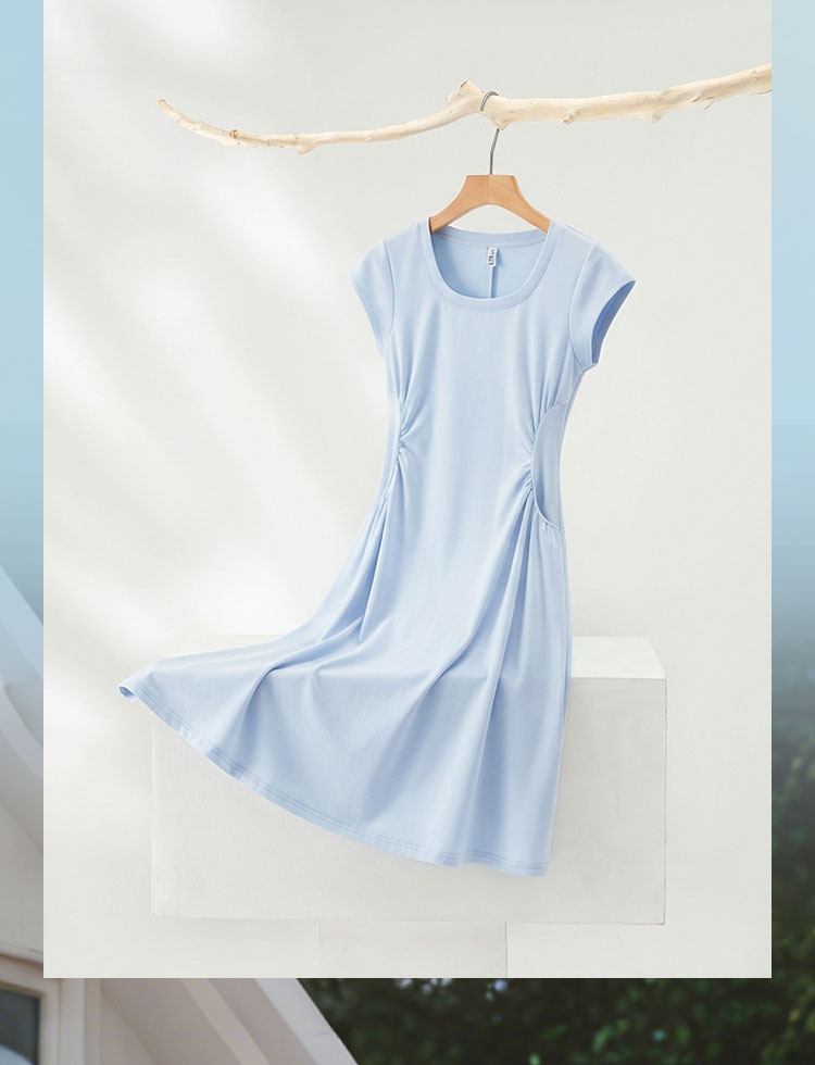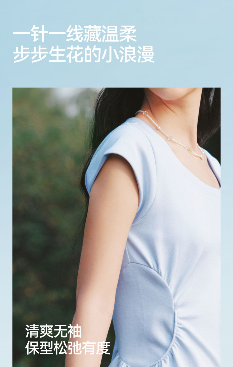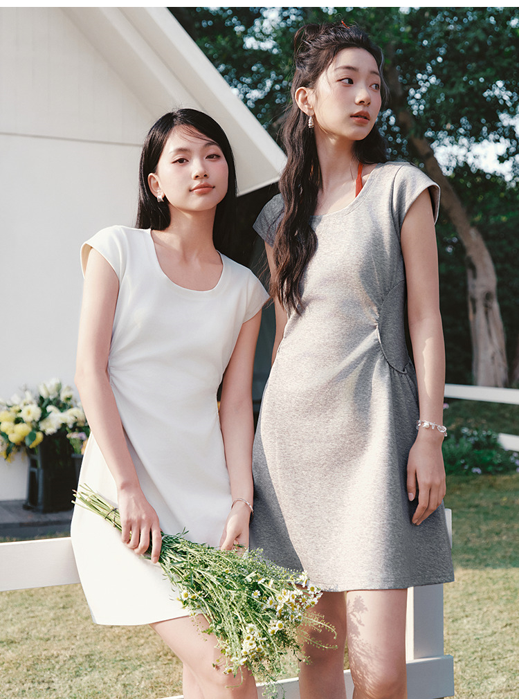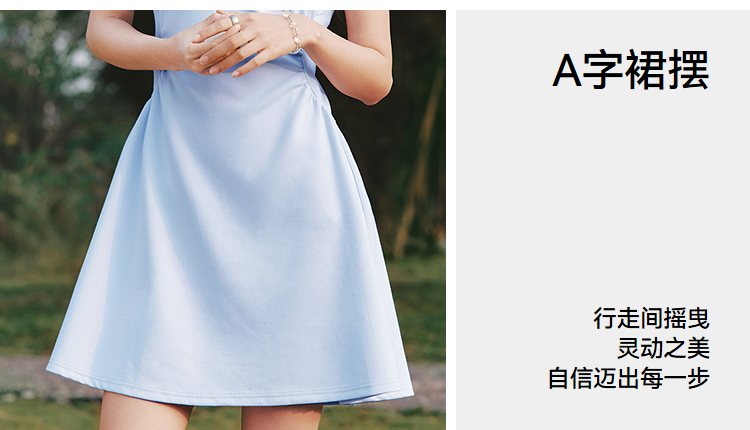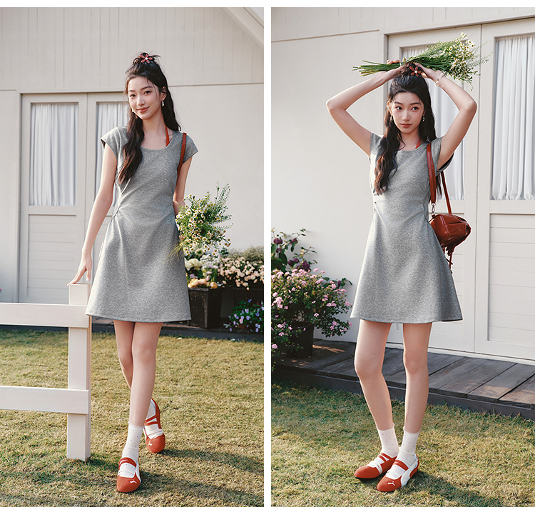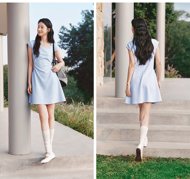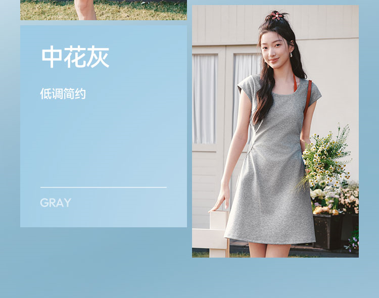森马连衣裙女夏季U领纯色褶皱短袖短裙2026新款简约风设计感裙子