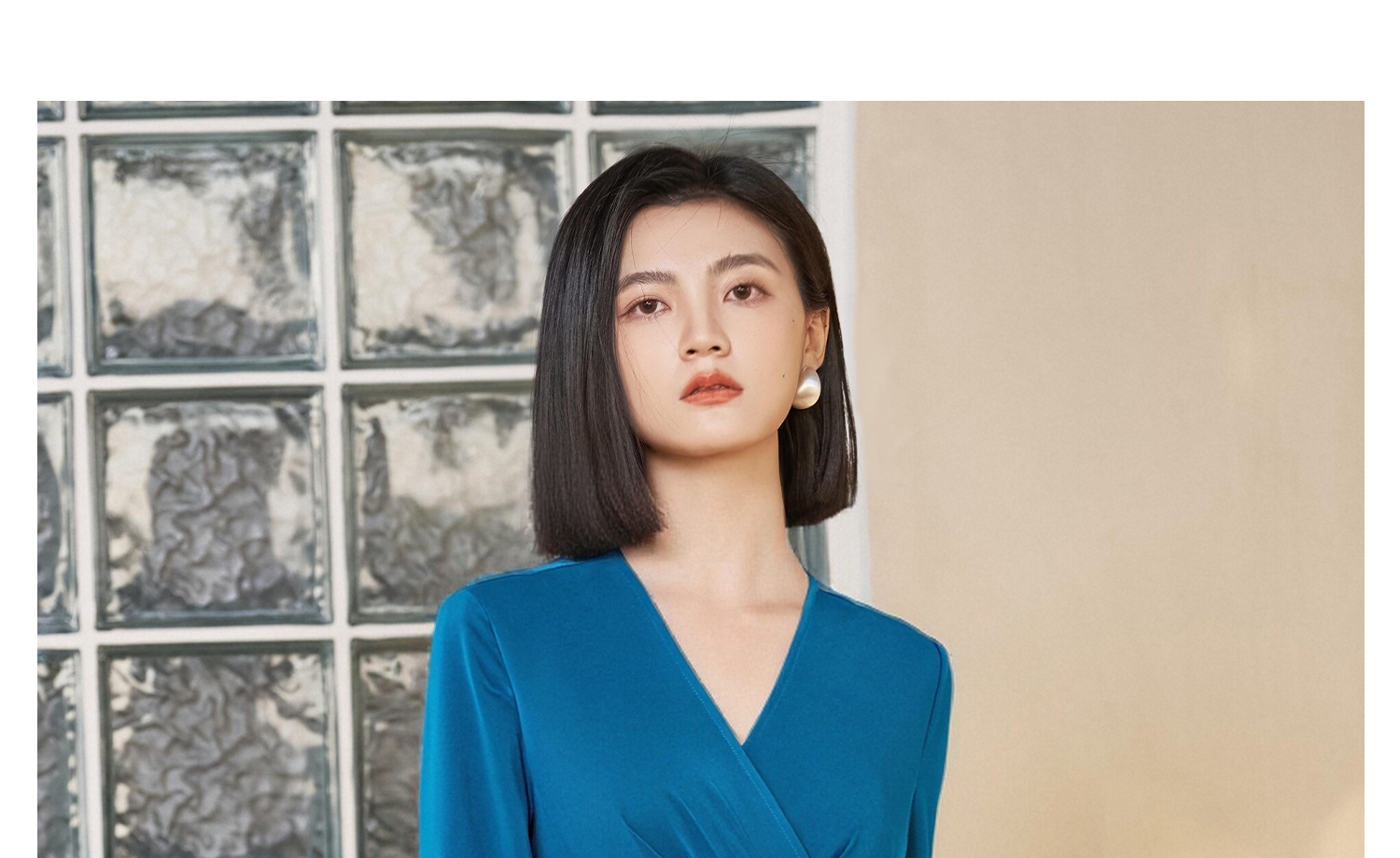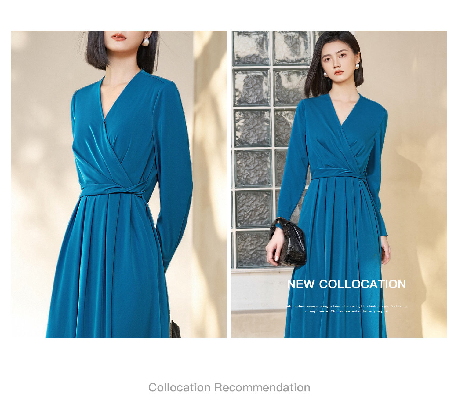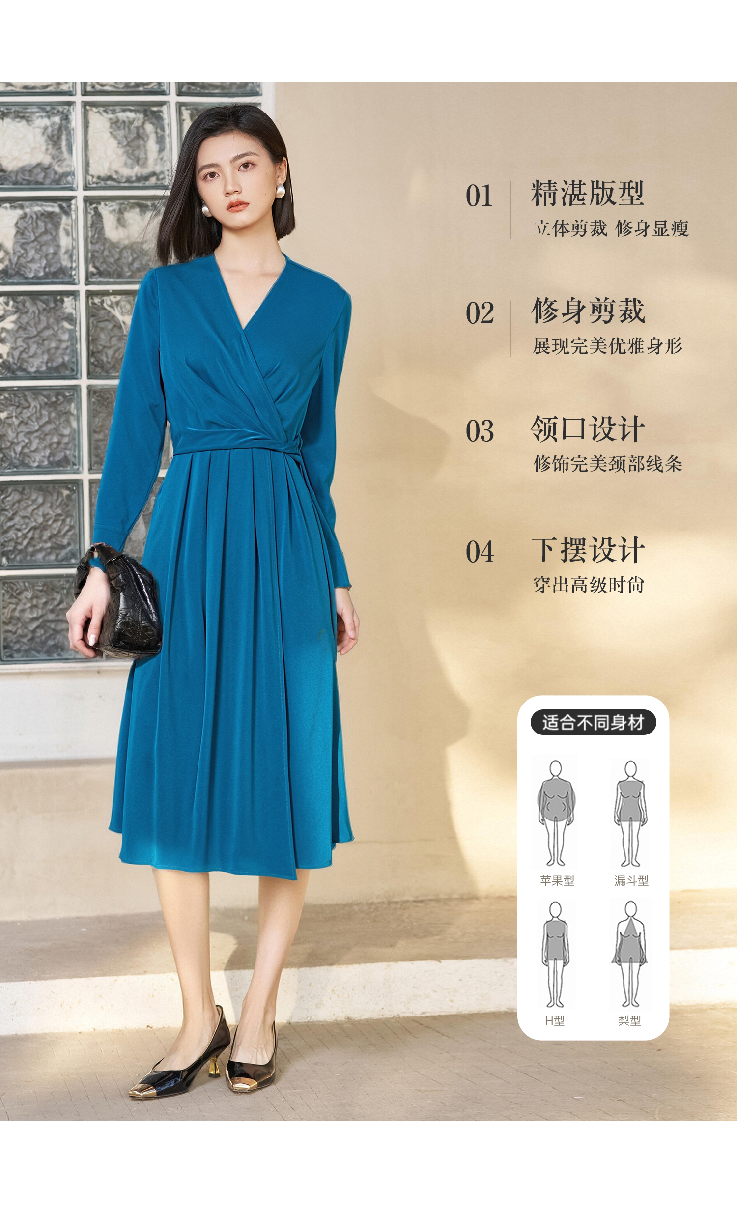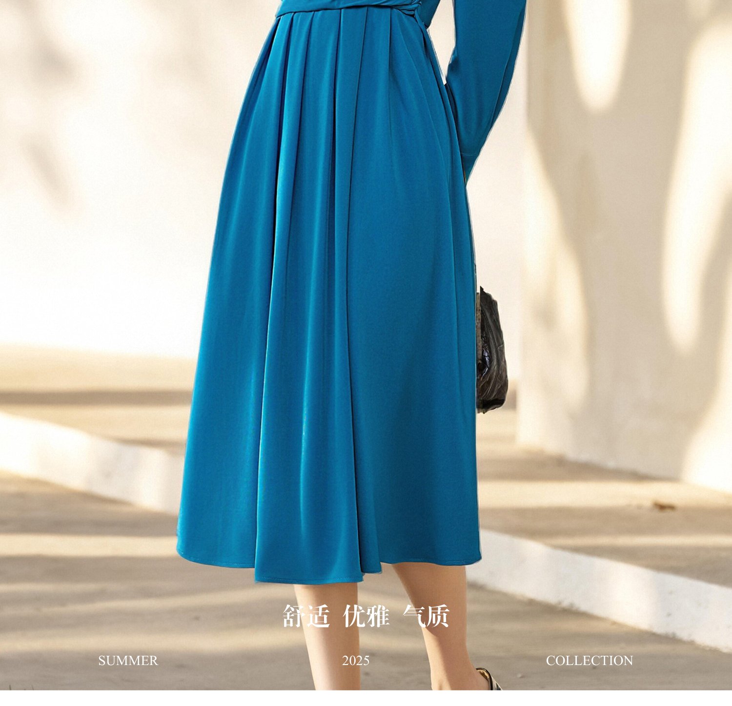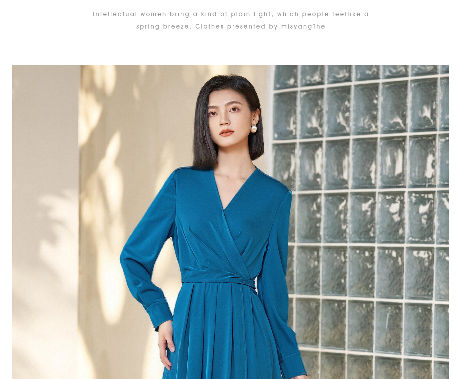 米思阳2026春季知性优雅风V领褶皱连衣裙收腰显瘦中长款大摆裙女4315