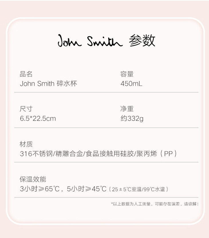 | 【品名】John Smith二代碎水杯 450ml 【规格】 【经典款】象牙白450ml 【立体雕花款】青蓝色450ml 【立体雕花款】桃粉色450ml 【立体雕花款】暮米色450ml 【5D喷绘款】粉之恋450ml 【5D喷绘款】绿之青450ml 【产地】上海 【发货地】浙江杭州 【发货快递】顺丰 【不发货区域】港澳台地区不发货 【补邮费地区】新疆、西藏+15元 【发货时效】48小时,节假日顺延 |
