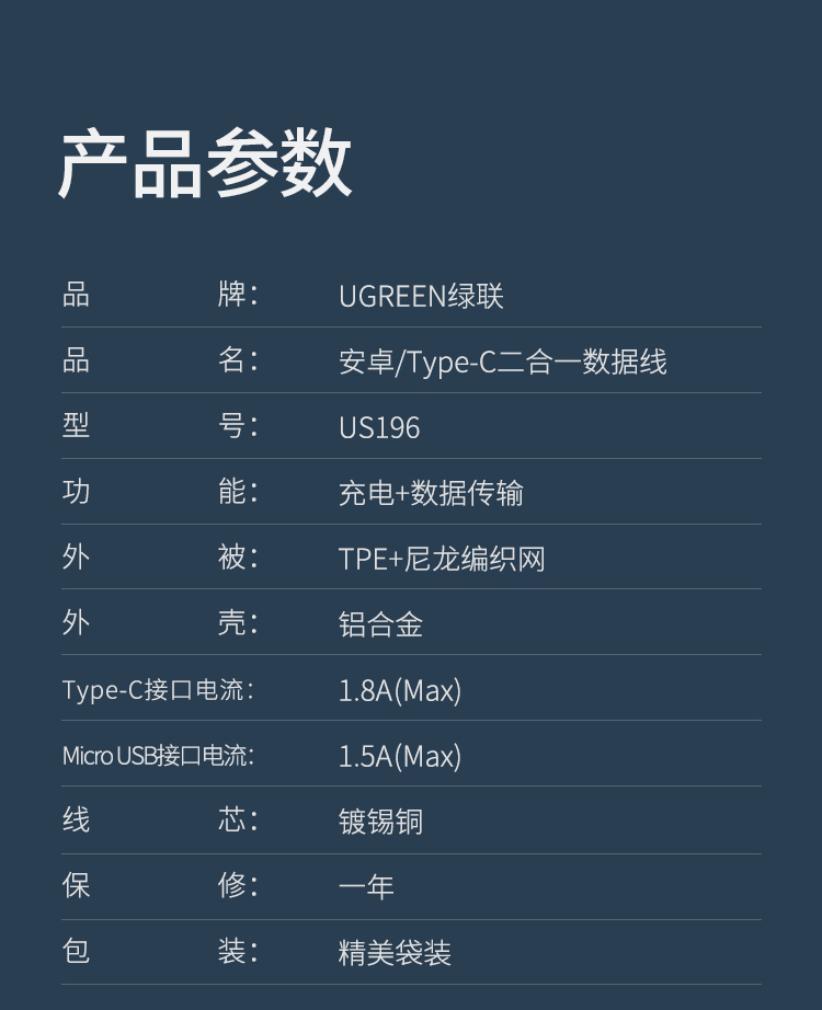 绿联 安卓/Type-C数据线二合一 多功能USB充电线多头两用 通用vivo华为P20/Mate20/荣耀8小米8手机 1米 30572