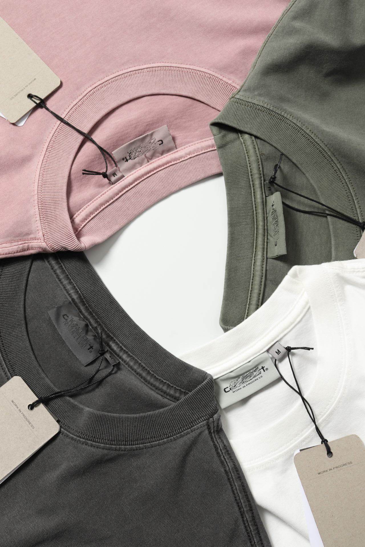 全新24ss Vista成衣蜡染水洗做旧系列短袖,采用260g精梳全棉成衣涂料染色工艺成衣水洗工艺,整体水洗做旧效果,骨位处落色完美,质感相当重磅同时上身亲肤且舒适,垂感十足。