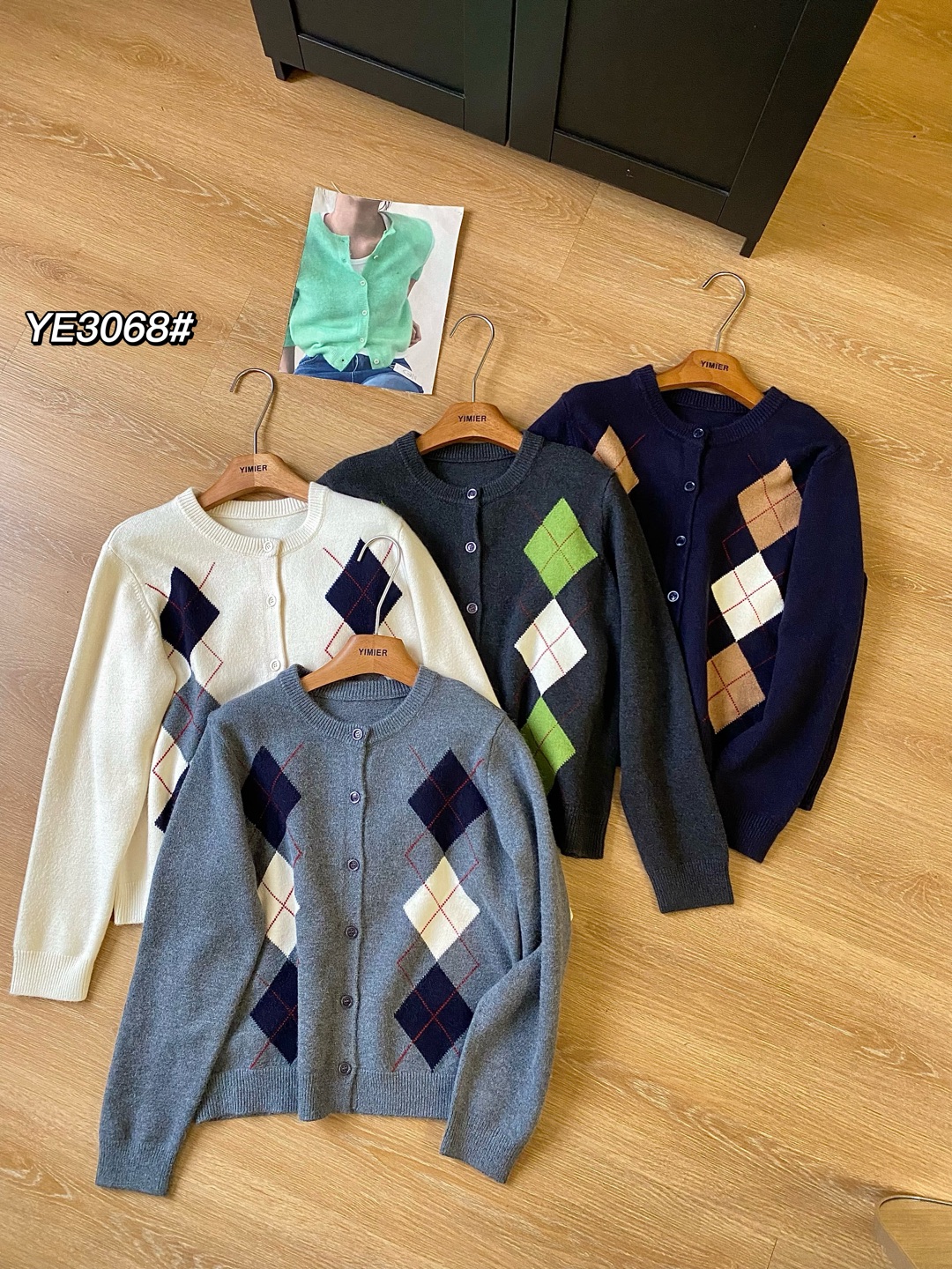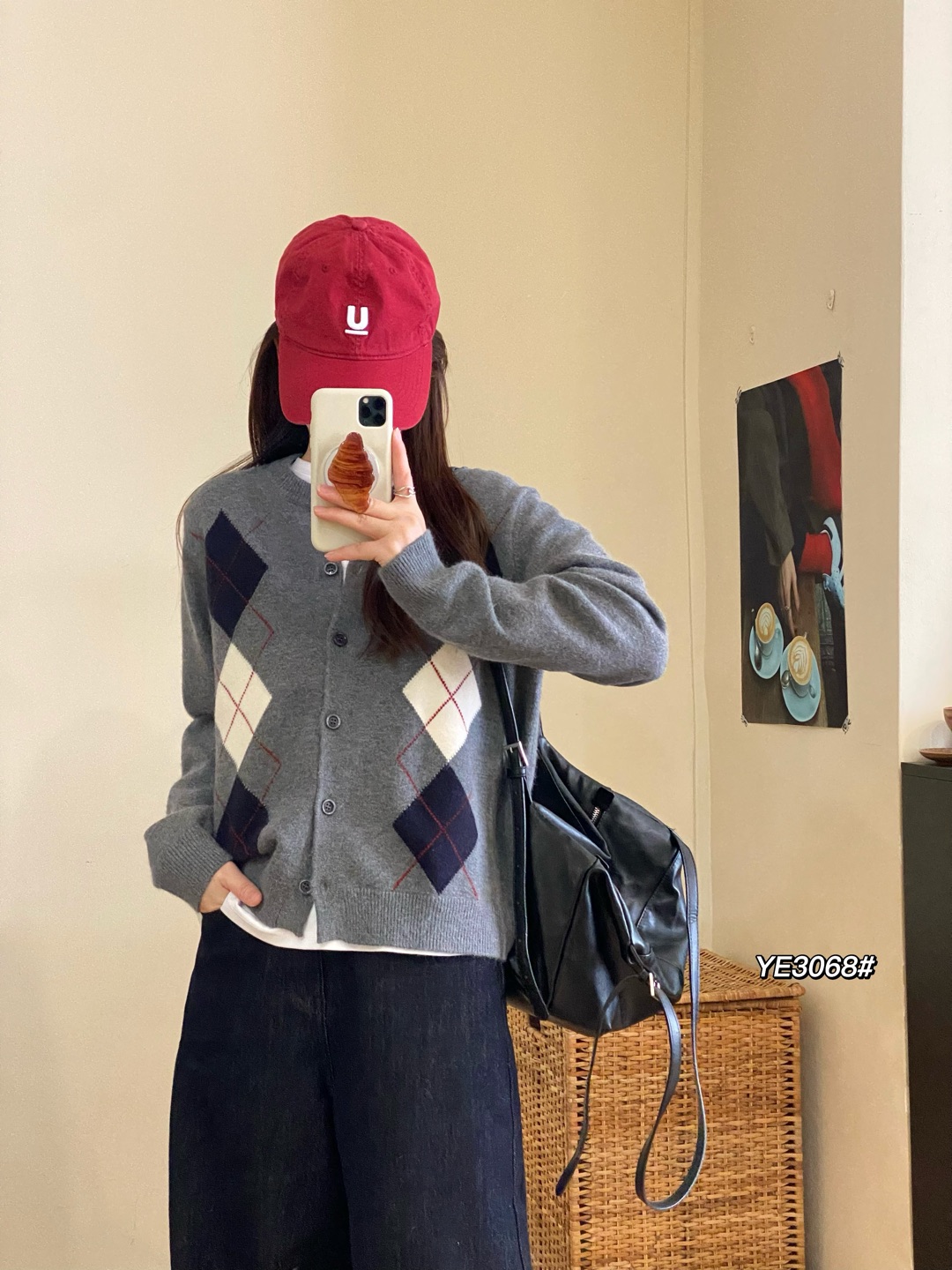 3068# 韩系复古撞色菱格纹开衫 版型设计对小个子非常友好,内穿外搭两不误!!最爱的宝藏单品