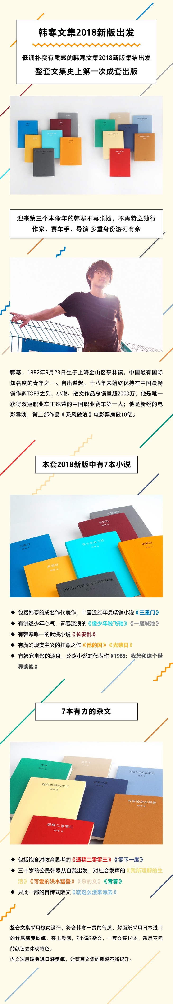 2018新版韩寒文集采用统一设计,极简的封面更符合韩寒一贯大气的风格,用纸更精心挑选,以日本进口的新罗纱纸配以内文瑞典进口的轻型纸,质感满分。