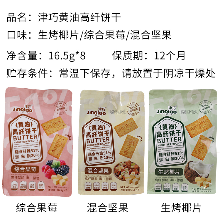 津巧黄油高纤饼干混合坚果味/生烤椰片味/综合果莓味132g 层层叠压酥脆不干硬 058328/058327/058326