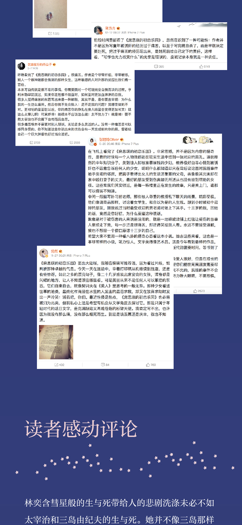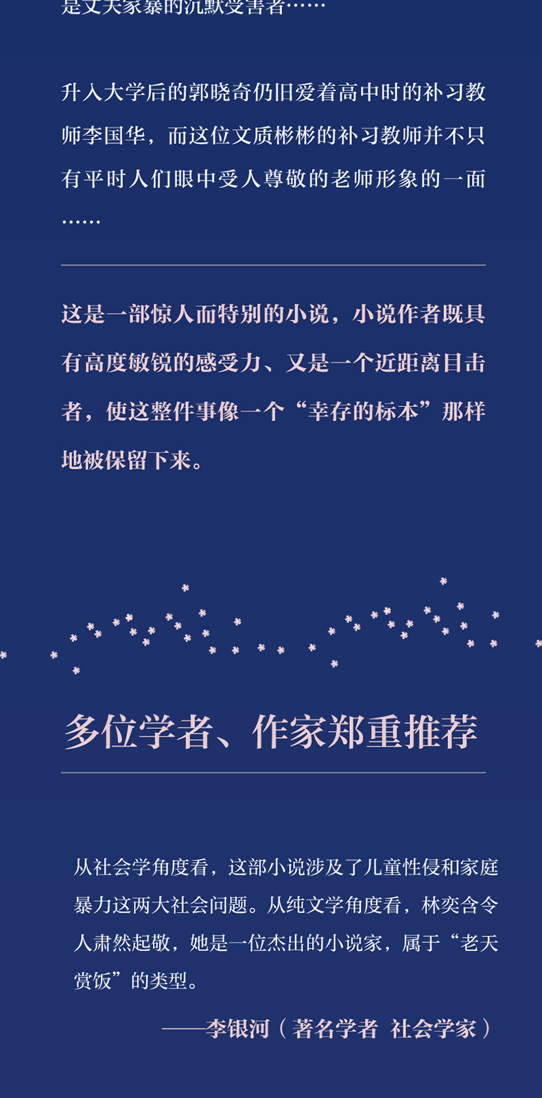 "从社会学角度看,这部小说涉及了儿童性侵和家庭暴力这两大社会问题。从纯文学角度看,林奕含令人肃然起敬,她是一位杰出的小说家,属于“老天赏饭”的类型。 ——李银河(**学者 社会学家)