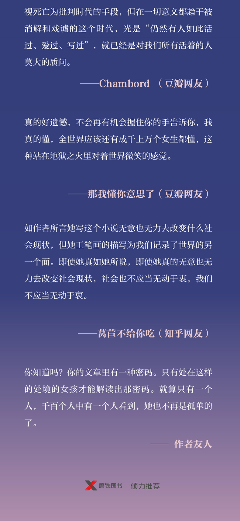 如作者所言她写这个小说无意也无力去改变什么社会现状,但她工笔画的描写为我们记录了世界的另一个面。即使她真如她所说,即使她真的无意也无力去改变社会现状,社会也不应当无动于衷,我们不应当无动于衷。 ——莴苣不给你吃(知乎网友)